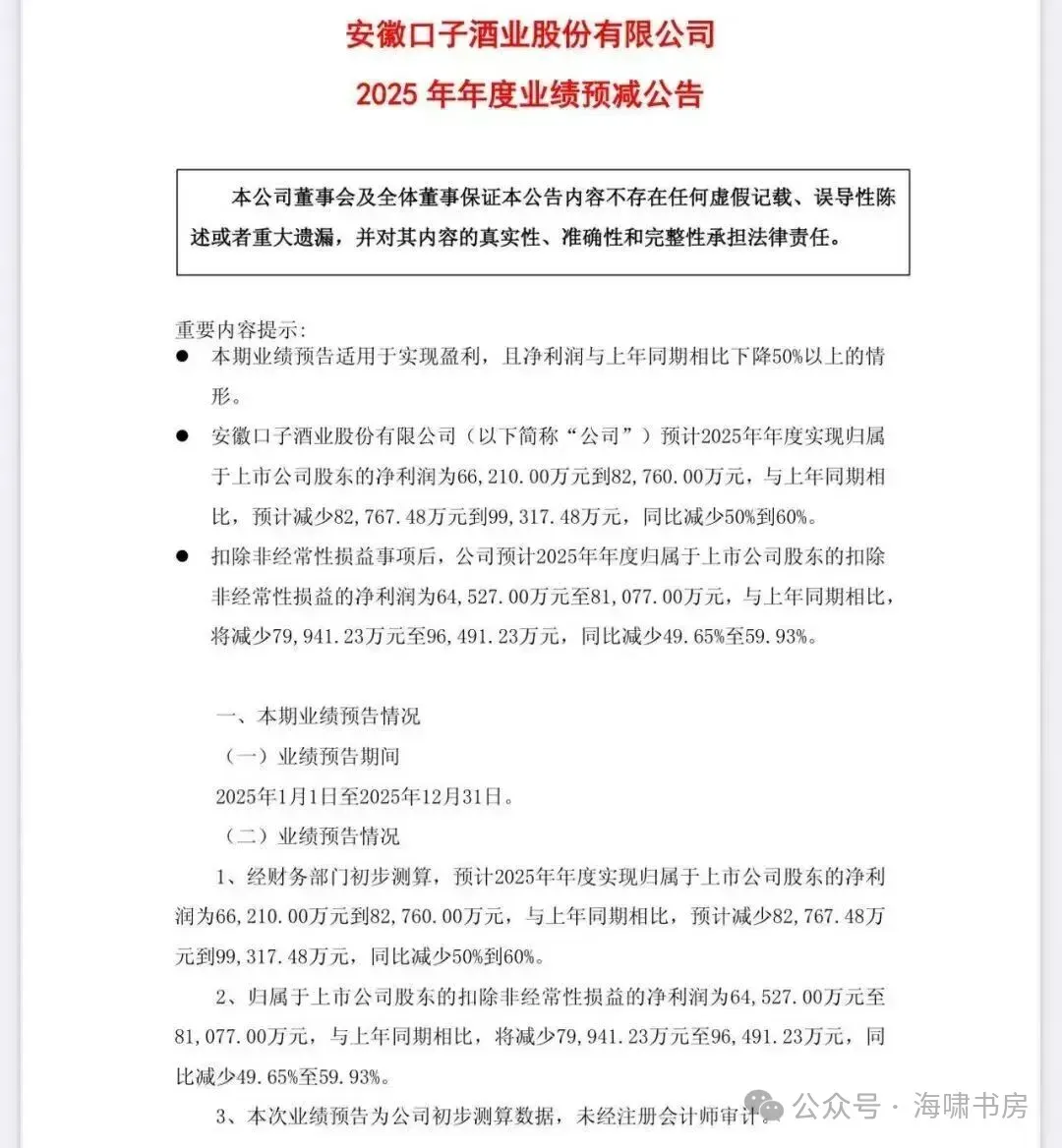 1月7日 口子窖业绩预告:预计2025年度归母净利润6.62-8.28亿,与上年同期相比,预计减少8.28-9.93亿,同比下降50%至60%。扣非净利润6.45-8.11亿,与上年同期相比,将减少7.99-9.65亿,同比下降49.65%至59.93%。