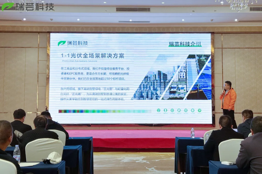 会上,瑞芸科技户用光伏总负责人张彬详细介绍了公司的“一体两翼”战略布局,即以研发制造与全链条服务为主体,以多元化业务与资源赋能为两翼,致力于为客户提供从项目开发、设计施工到运营维护的一站式能源解决方案。