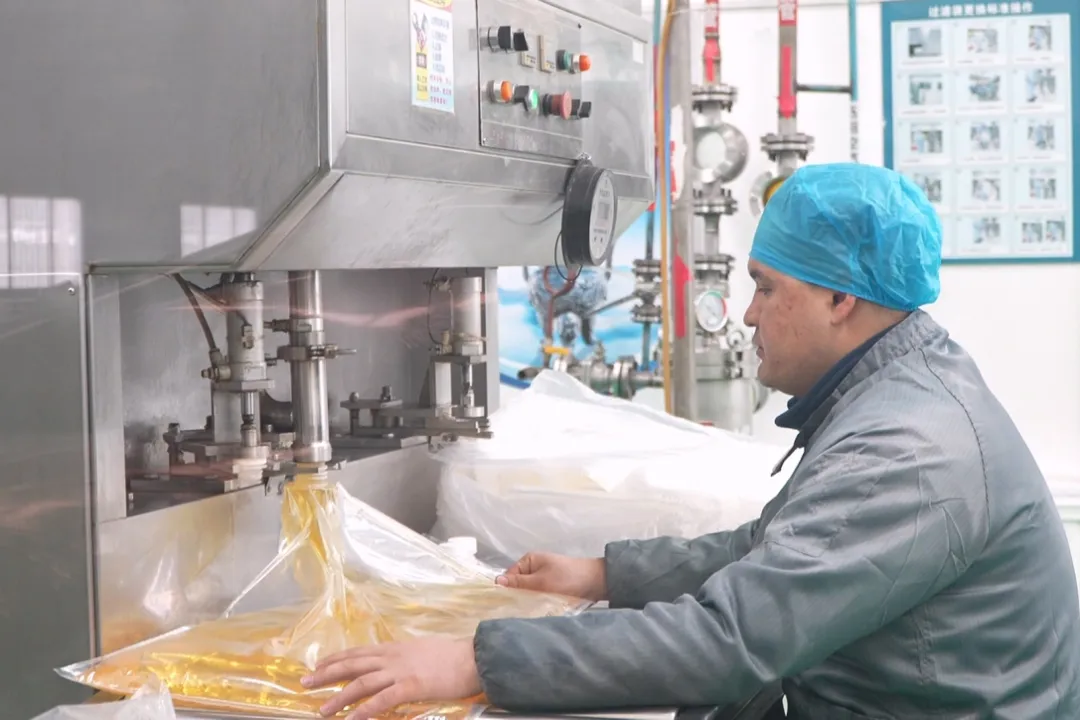 1月21日,阿克苏汗腾生物科技有限公司包装车间工人正进行棉籽油灌装、贴标作业。通讯员 张勇 摄