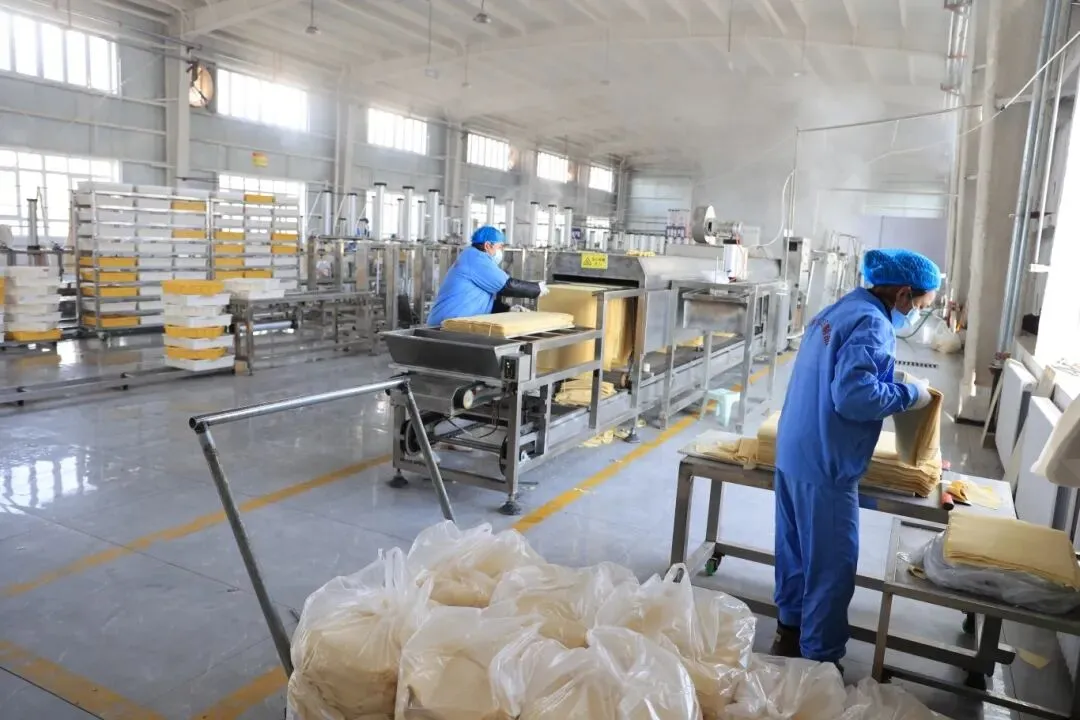 1月15日,在库车市齐满镇一家豆制品加工厂内,工人各司其职,进行磨浆、成型、压制、包装等作业。通讯员 王红丽 摄