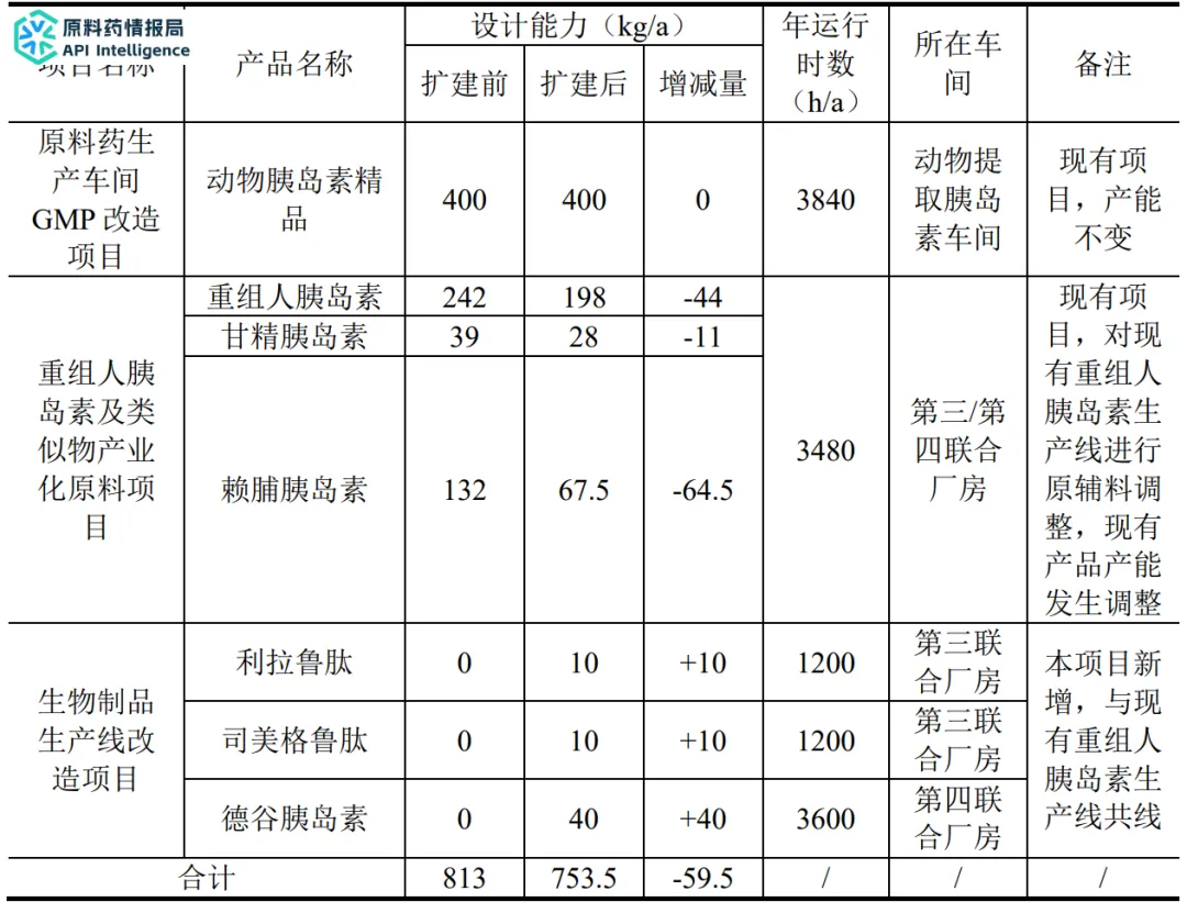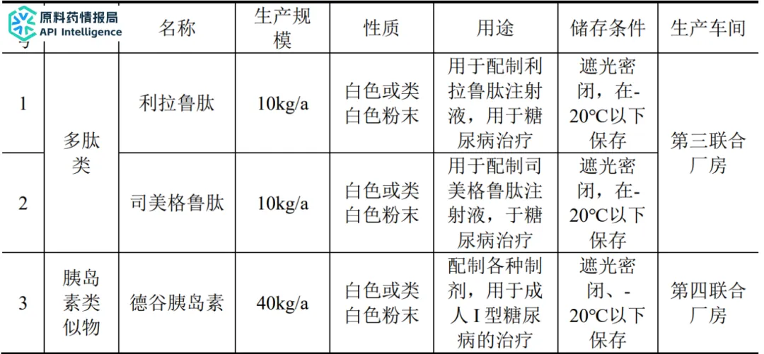 本项目利用原有生产线部分设备设施,增加多肽类药品原料生产,年产利拉鲁肽10kg,司美格鲁肽10kg,同时对原有重组人胰岛素生产线进行原辅料调整,增加德谷胰岛素生产,年产德谷胰岛素40kg。