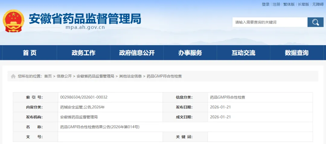 药品GMP符合性检查结果公告(2026年第014号)