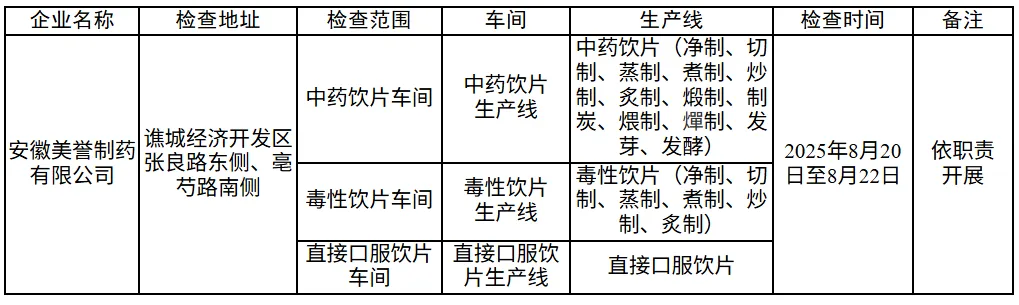 据《中华人民共和国药品管理法》《药品生产监督管理办法》等有关规定,我局于2025年8月20日至8月22日依职责对安徽美誉制药有限公司开展了药品GMP符合性检查合并“双随机、一公开”检查。经现场检查并综合评定,本次依职责开展的药品GMP符合性检查结论为符合要求,现予以公告。