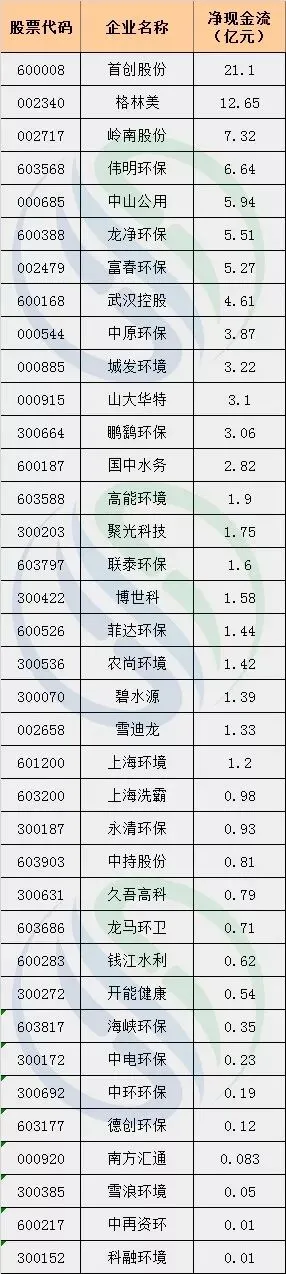 统计列表可见,在水务、固废、再生三大领域,首创股份、伟明环保、格林美三家企业的净现金流处于较高水平。