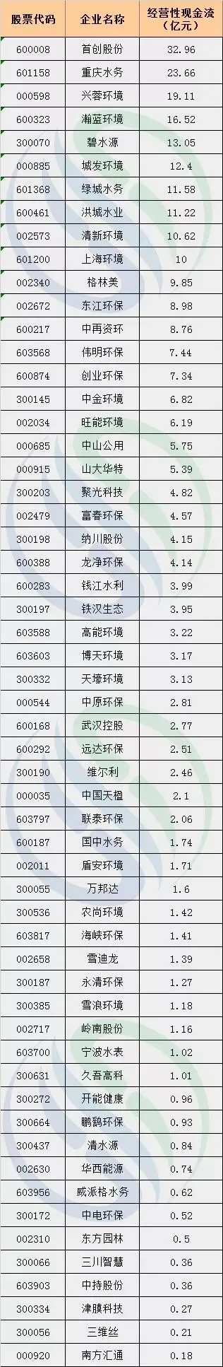 在80家统计企业中,仅57家经营性现金流为正数,占比71%。这57家企业净现金流数据及排行如下表所示。统计可见,经营性现金流较好的企业多为水务企业,其中,地方区域水务公司的经营优势显著,这与区域水务公司手中大量的经营性水务资产有着直接联系。