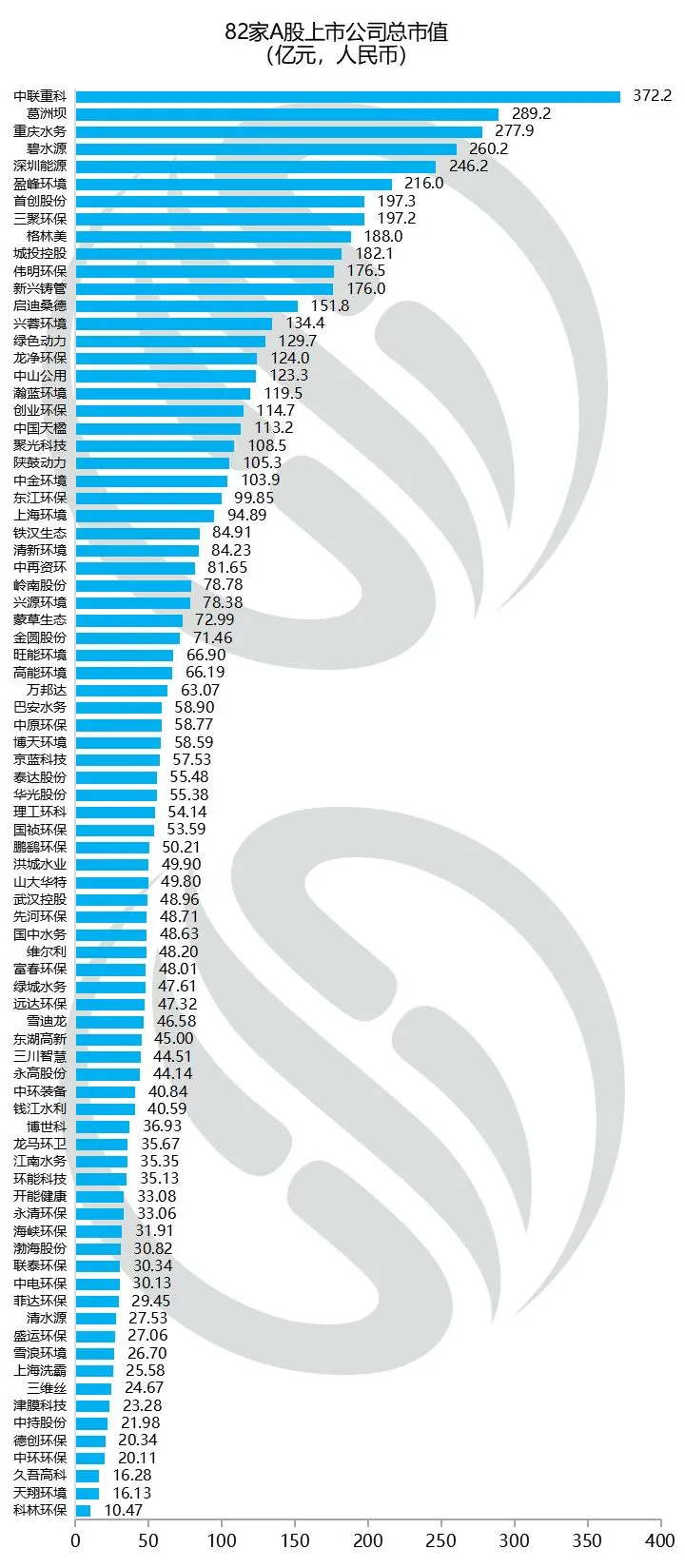 E20研究院数据中心长期以来对涉及环保业务的上市公司均有关注,基于上市公司公告,本文共选取了105家上市公司进行盘点,并对其总市值进行排名,其中选取的A股上市公司82家,港股上市公司23家,新加坡上市公司4家。对于多地上市的公司,在不同排名中均有出现。