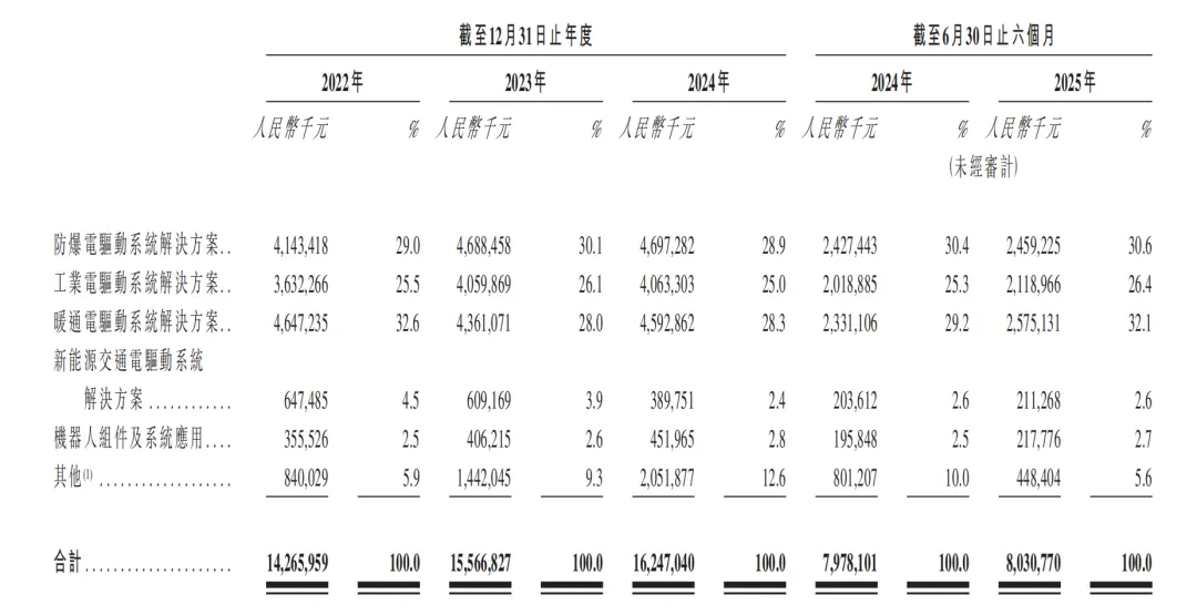 卧龙的营收结构最新的得看他港股的招股说明书,24年营收162.47亿,25年上半年营收约80.31亿。按最新招股说明书的分类法,主要分为防爆电驱动系统解决方案、工业电驱动系统解决方案、暖通电驱动系统解决方案、新能源交通电驱动系统解决方案和机器人组件及系统应用,共五大类。