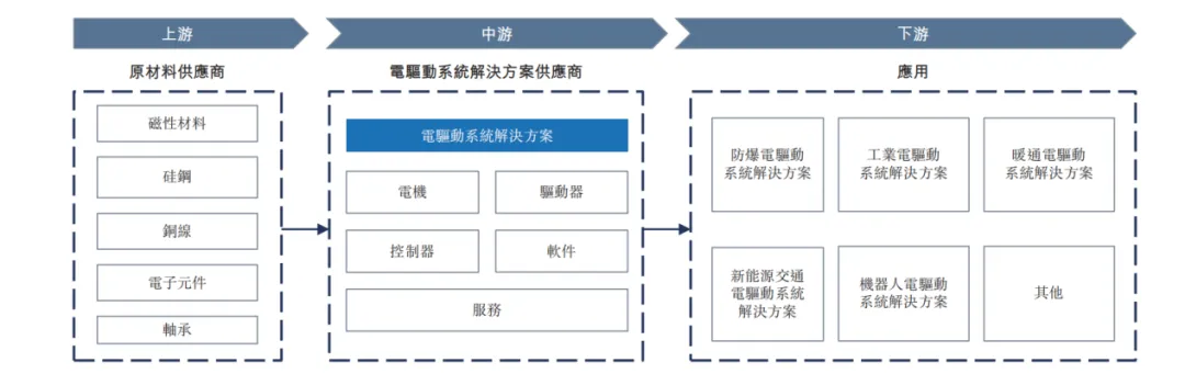 按照招股说明书中的介绍,电驱动系统解决方案指将电机、驱动器、控制器、软件及相关服务相组合。电机作为解决方案的核心传动单元,将电能转换为机械能,从而实现旋转或直线运动。驱动器根据信号调整及输出适当的电能,以控制电机的操作参数。控制器根据输入信号生成控制逻辑,为解决方案制定运行决策。电驱动系统解决方案亦包括软件,有关软件是确保高效、安全及智能化运行的核心。