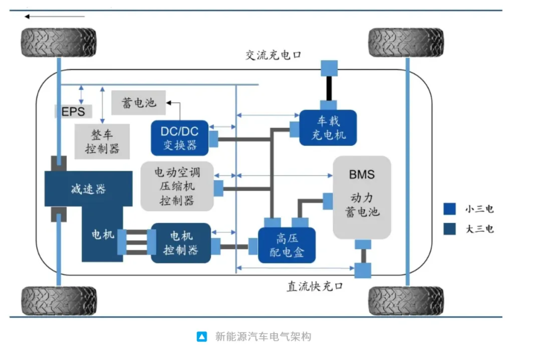 电车一般讲有三大件,电池、电驱和电控。电池就是新能源汽车的能量来源,电驱主要负责将电能转化为机械能,为车辆提供驱动力,性能直接影响车辆的加速、爬坡和最高速度。电驱里也包含电机控制器,电机控制器和电控有所差别,电控更多是基于整车的控制,是电车的大脑,除了协同电机工作,还包含BMS等,所以相当于电控系统给电机控制器发送指令,再驱动电机运行。