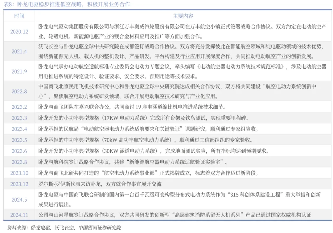 卧龙在低空这块的电驱算是走在行业前列,早于2019年布局成立了电动航空研发中心,专注于航空电驱系统开发,制定了“3+1”战略,即“小、中、大”三大战略等级及1个民航适航标准:1)小功率产品(<30kW,主要应用无人机及eVTOL)现已形成4kW,6kW,9kW,12kW,15kW,30kW系列产品。2)中功率产品(50kW~175kW,主要应用eVTOL);积极对接沃飞、商飞等头部eVTOL企业,其中沃飞2025年2月首席市场官表示,AE200年内将进入载人飞行试验阶段,预计2026年下半年完成TC取证,27年底迎来量产运行。3)大功率产品(百千瓦级以上,主要应用19或30座电动航空场景)。