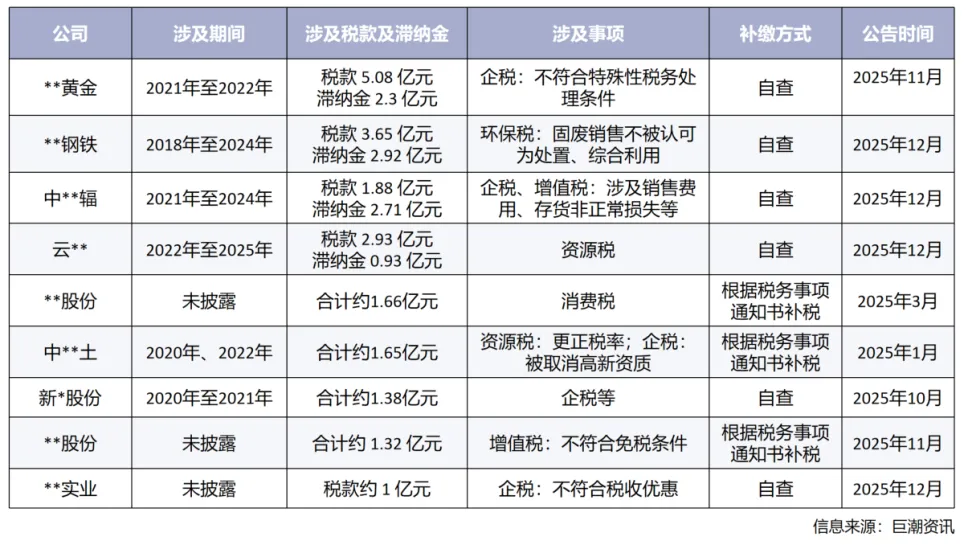 据不完全统计,2025年有9家上市公司发布公告称其或下属子公司补缴税款、滞纳金超1亿元,其中数额最高的为某公司因不符合特殊性税务处理条件补缴企业所得税、滞纳金合计高达7亿余元。从下图可以看出,涉及税种不仅包括企业所得税、增值税等主要税种,还包括环保税、资源税等“小税种”,涉及期间最早溯及2018年,多数公司以自查的方式完成税款的补缴,基本未涉及稽查程序。