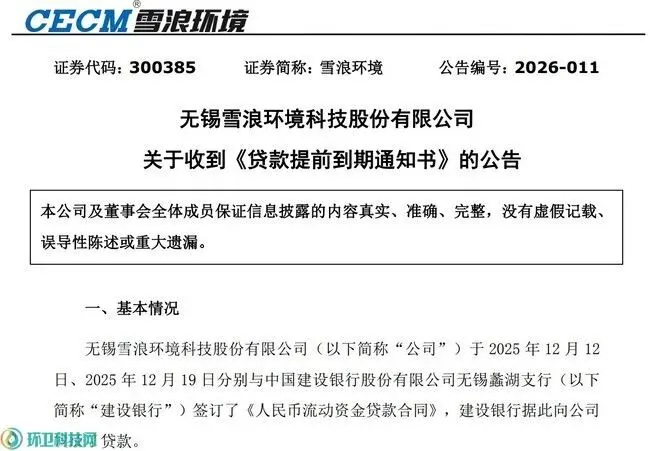 环卫科技网讯,雪浪环境(300385)1月22日发布公告,宣布收到建设银行通知,要求其三个工作日内偿还近7500万元贷款本金及利息,否则将“要求公司承担违约责任,直到诉诸法律”。