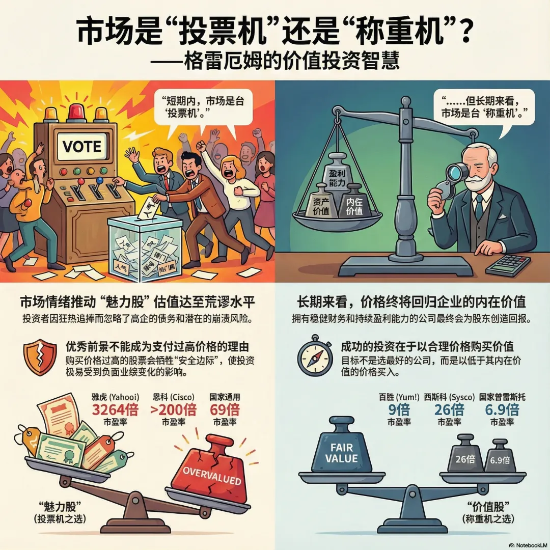 这句话深刻地揭示了价格与价值的关系。在短期内,股票价格受制于大众的集体情绪(“投票”),谁最受欢迎,谁的股价就可能被推高。这解释了像 AAA Enterprises 或雅虎这样缺乏实际盈利的公司为何能获得天文数字的估值。但从长远来看,价格终将由企业的内在价值和盈利能力(“称重”)决定。聪明的投资者必须像格雷厄姆一样,在 “投票” 期间保持冷静,拒绝为市场狂热支付过高的溢价,坚持用审慎的分析来衡量公司的内在重量(价值),从而最终从投机者的愚蠢中获利。