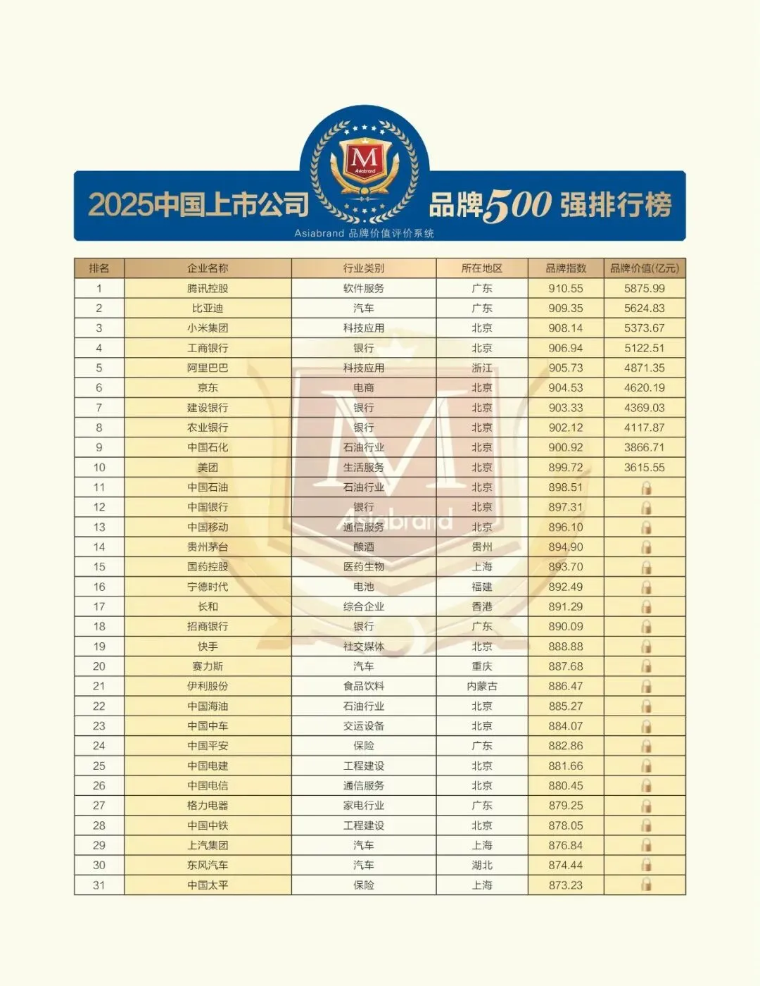 品牌价值表现亮眼,“2025中国上市公司品牌500强”品牌总价值达42.03万亿元,平均价值增至840.53亿元,TOP10门槛较上年提升12.3%,国家电网、比亚迪、京东等龙头企业凭借技术创新与全球布局领跑榜单,品牌价值增速远超平均水平。值得关注的是,ESG绩效与品牌价值关联度持续提升,波司登、恒力等企业以绿色转型、智慧制造实现排名跃升,彰显可持续发展的时代共识。
