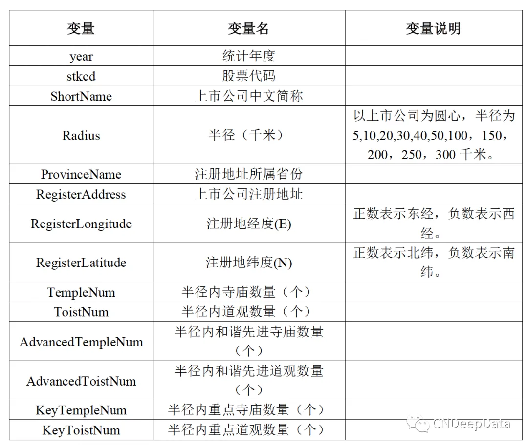 ▪ 数据说明:CNDD上市公司注册地与宗教活动场所的距离数据统计了我国上市公司的统计年度、股票代码、上市公司中文简称、半径(千米)、注册地址所属省份、上市公司注册地址、注册地经度(E)、注册地纬度(N)、半径内寺庙数量(个)、半径内道观数量(个)等变量。数据提供.dta和.xlxs两种格式。