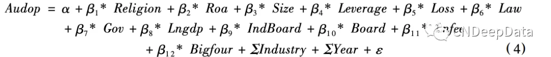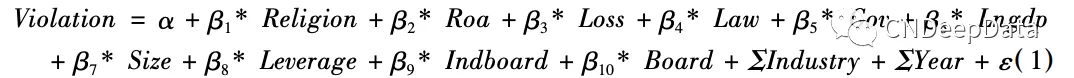 模型( 1) 采用 Logistic 回归估计模型。其中,因变量 Violation 为上市公司的违规情况。当年涉 及违规时 Violate 取 1,否则取 0。由于上市公司违规的行为无法被直接观测到,只有当上市公司违 规行为被处罚并公布时,才能知晓其违规行为,所以本文沿用陈国进等( 2005) 的方法,以因违规受 到处罚的上市公司作为违规研究样本。利用 CSMAR 数据库“上市公司违规事件及其公告文件”中 的数据,通过对被处罚公司进行追溯的方法,将被处罚的违规行为涉及的年份定义为违规年份, 以上市公司当年是否违规衡量其是否违规。③ Religion 为衡量宗教影响的各个指标。宗教指标数 值越高,代表宗教的影响越高。按照假设 1,预期 β1 < 0,即宗教影响越高,公司越不容易违规。控制变量包括公司层面和地区层面影响公司治理的变量。公司层面变量包括: Roa 为净利润/( 期初总值产与期末总资产均值) ; Loss 为哑变量,公司当年亏损取 1,否则取 0; Size 为公司年末总资产的 自然对数; Leverage 为公司年末总负债/总资产; Indboard 为上市公司独立董事数量; Board 为上市公司董事会规模。地区层面变量包括: Law 为各省法律发展指数; Gov 为各省政府干预程度指数; Lngdp 为当年该省 GDP 的对数。Industry 为行业虚拟变量,Year 为年度虚拟变量。