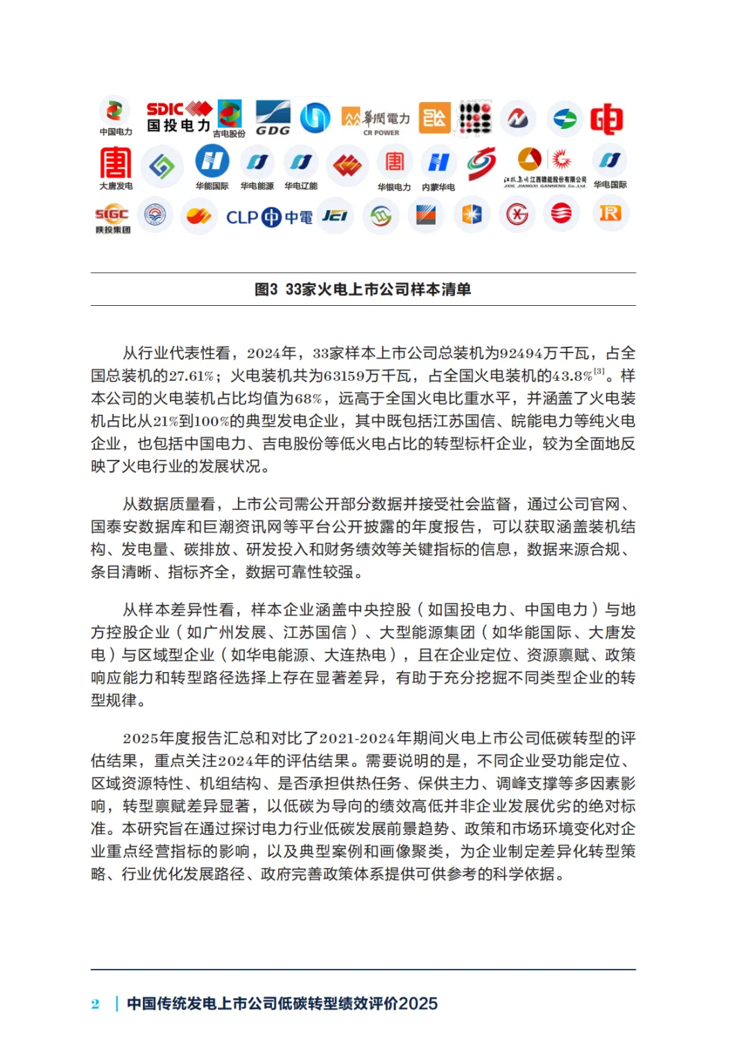 课题组自2022年起围绕中国火电上市公司低碳转型开展研究,基于上市公司年报等公开数据,对33家样本火电上市公司的低碳转型基础绩效和变化绩效进行评估。这33家样本上市公司装机占全国总装机的近28%,火电装机占全国火电装机的近44%,并涵盖了从纯火电企业到低火电占比的转型标杆企业,较为全面地反映了火电行业的发展全貌。
