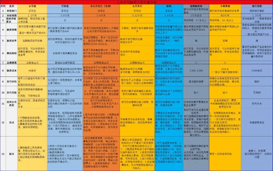 如前所述,上市公司有十多种的融资方式,但主要用的也就三五种,因此,棱镜君编制了下面的这张《上市公司融资工具比较分析表》,主要列明了公司债、可转债、定向增发等八种上市公司常用的融资工具,并从审批部门、审核周期、利弊分析等十三个角度分别对这八种融资工具进行了对比分析。由于下图分辨率太高,平台无法完全显示清楚内容,如感兴趣的朋友可以私信我,我发送原图给你。