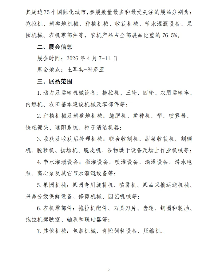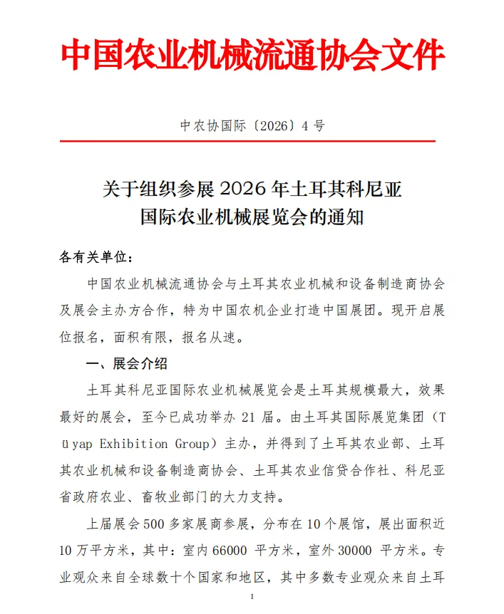 为助力我国农机企业开拓国际市场,加强国际交流与合作,中国农业机械流通协会将与土耳其农业机械和设备制造商协会及展会主办方深度合作,共同组织中国展团参加2026年土耳其科尼亚国际农业机械展览会。