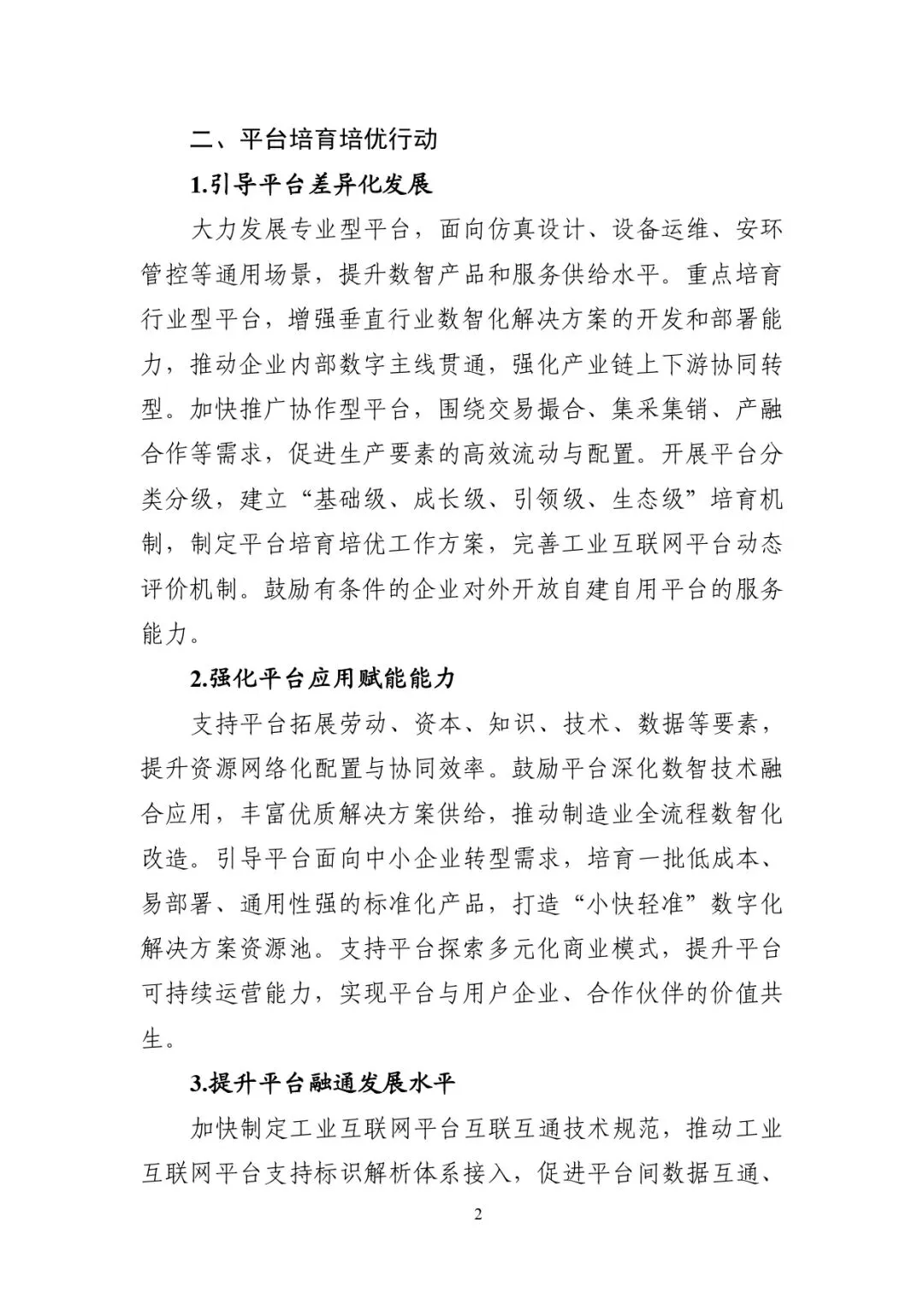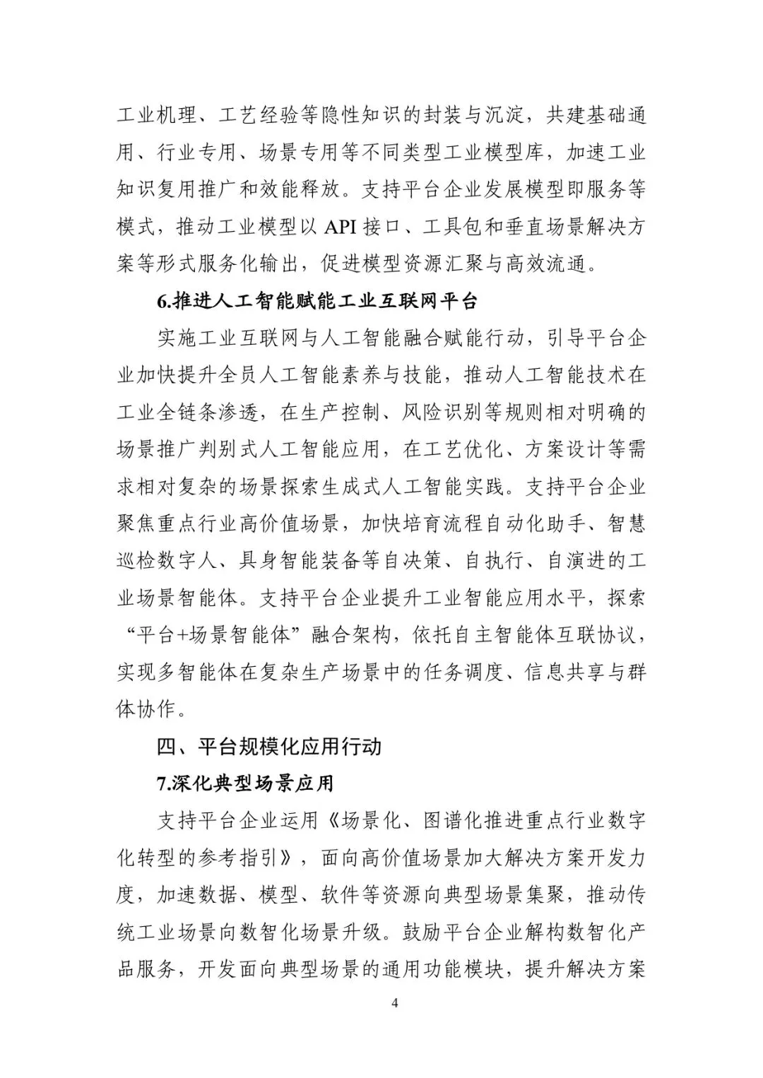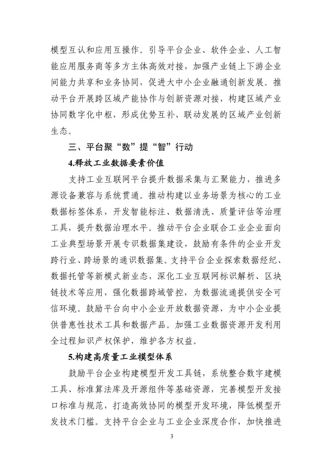 工业互联网平台是海量数据汇聚、模型沉淀和应用开发的关键载体,是工业要素资源泛在连接、弹性供给和高效配置的重要枢纽,是支撑产业智能化、绿色化、融合化发展的战略性基础设施。为贯彻党中央、国务院决策部署,推动工业互联网平台高质量发展,制定本方案。以习近平新时代中国特色社会主义思想为指导,全面贯彻党的二十大和二十届历次全会精神,牢牢锚定实现新型工业化这一关键任务,以推动高质量发展为主题,以发展新质生产力为重点,以促进信息化和工业化深度融合为主线,抢抓数智化变革机遇,加快新一代信息技术全方位全链条普及应用,推动工业互联网平台迭代演进和规模推广,为推进新型工业化提供有力支撑。到 2028年,工业互联网平台高质量发展取得积极成效,“专业型+行业型+协作型”多层次平台体系持续壮大,具有一定影响力的平台超 450 家;平台的要素资源连接能力大幅增强,重点平台的数据增值、模型沉淀和人工智能开发应用能力显著提升,工业设备连接数突破 1.2 亿台(套);平台普及率达到55%以上,基本建成泛在互联、数智融合、深度协同、开源开放的新一代工业互联网平台生态。大力发展专业型平台,面向仿真设计、设备运维、安环管控等通用场景,提升数智产品和服务供给水平。重点培育行业型平台,增强垂直行业数智化解决方案的开发和部署能力,推动企业内部数字主线贯通,强化产业链上下游协同转型。加快推广协作型平台,围绕交易撮合、集采集销、产融合作等需求,促进生产要素的高效流动与配置。开展平台分类分级,建立“基础级、成长级、引领级、生态级”培育机制,制定平台培育培优工作方案,完善工业互联网平台动态评价机制。鼓励有条件的企业对外开放自建自用平台的服务能力。支持平台拓展劳动、资本、知识、技术、数据等要素,提升资源网络化配置与协同效率。鼓励平台深化数智技术融合应用,丰富优质解决方案供给,推动制造业全流程数智化改造。引导平台面向中小企业转型需求,培育一批低成本、易部署、通用性强的标准化产品,打造“小快轻准”数字化解决方案资源池。支持平台探索多元化商业模式,提升平台可持续运营能力,实现平台与用户企业、合作伙伴的价值共生。加快制定工业互联网平台互联互通技术规范,推动工业互联网平台支持标识解析体系接入,促进平台间数据互通、模型互认和应用互操作。引导平台企业、软件企业、人工智能应用服务商等多方主体高效对接,加强产业链上下游企业间能力共享和业务协同,促进大中小企业融通创新发展。推动平台开展跨区域产能协作与创新资源对接,构建区域产业协同数字化中枢,形成优势互补、联动发展的区域产业创新生态。支持工业互联网平台提升数据采集与汇聚能力,推进多源设备兼容与系统贯通。推动构建以业务场景为核心的工业数据标签体系,开发智能标注、数据清洗、质量评估等治理工具,提升数据治理水平。推动平台企业联合工业企业面向工业典型场景开展专识数据集建设,鼓励有条件的企业开发跨行业、跨场景的通识数据集。支持平台企业探索数据经纪、数据托管等新模式新业态,深化工业互联网标识解析、区块链技术等应用,强化数据跨域管控,为数据流通提供安全可信环境。鼓励平台向中小企业开放数据资源,为中小企业提供普惠性技术工具和数据产品。加强工业数据资源开发利用全过程知识产权保护,维护各方权益。鼓励平台企业构建模型开发工具链,系统整合数字建模工具、标准算法库及开源组件等基础资源,完善模型开发接口标准与规范,打造高效协同的模型开发环境,降低模型开发技术门槛。支持平台企业与工业企业深度合作,加快推进工业机理、工艺经验等隐性知识的封装与沉淀,共建基础通用、行业专用、场景专用等不同类型工业模型库,加速工业知识复用推广和效能释放。支持平台企业发展模型即服务等模式,推动工业模型以 API接口、工具包和垂直场景解决方案等形式服务化输出,促进模型资源汇聚与高效流通。实施工业互联网与人工智能融合赋能行动,引导平台企业加快提升全员人工智能素养与技能,推动人工智能技术在工业全链条渗透,在生产控制、风险识别等规则相对明确的场景推广判别式人工智能应用,在工艺优化、方案设计等需求相对复杂的场景探索生成式人工智能实践。支持平台企业聚焦重点行业高价值场景,加快培育流程自动化助手、智慧巡检数字人、具身智能装备等自决策、自执行、自演进的工业场景智能体。支持平台企业提升工业智能应用水平,探索 “平台+场景智能体”融合架构,依托自主智能体互联协议,实现多智能体在复杂生产场景中的任务调度、信息共享与群体协作。支持平台企业运用《场景化、图谱化推进重点行业数字化转型的参考指引》,面向高价值场景加大解决方案开发力度,加速数据、模型、软件等资源向典型场景集聚,推动传统工业场景向数智化场景升级。鼓励平台企业解构数智化产品服务,开发面向典型场景的通用功能模块,提升解决方案可迁移、可复制能力。引导制造企业深化场景应用,发展平台支撑的数字化管理、平台化设计、智能化生产、网络化协同、个性化定制、服务化延伸等新模式新业态。鼓励大企业深化平台应用,推动研发、生产、管理、服 务