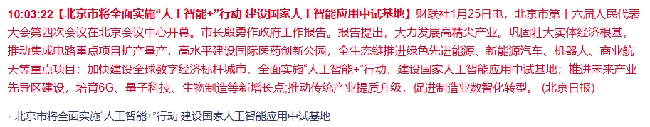 这次政策有清晰的铺垫和配套。2025年北京信息传输、软件和信息技术服务业增加值已达12192.4亿元,增长11.0%,为“人工智能+”奠定基础;2026年1月4日先发布中试平台支持政策,1月23日再明确超15亿元高精尖产业资金投向,此次政府工作报告是对全年产业方向的正式定调。核心逻辑是靠政策资金撬动技术转化,让北京在AI、集成电路等领域保持领先,同时培育未来产业新增长点。