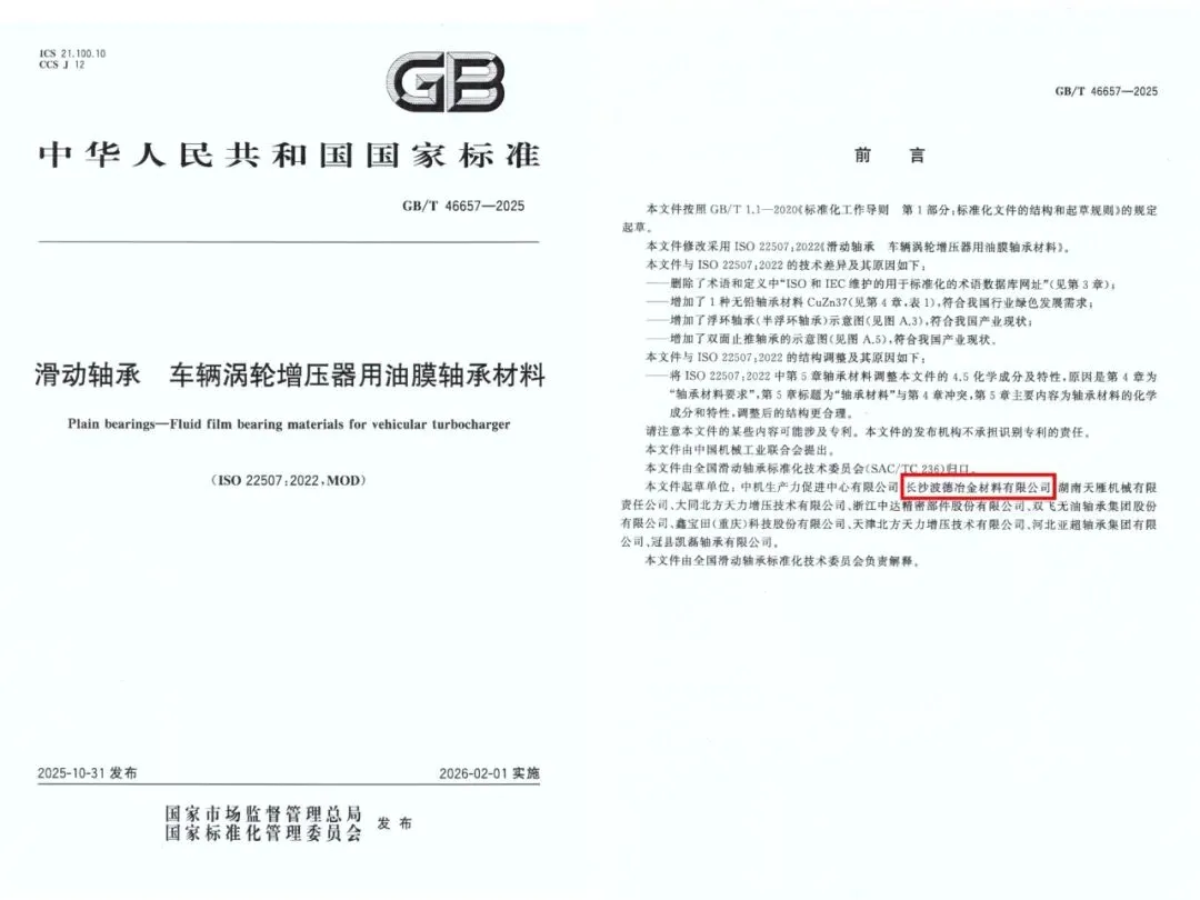 国家市场监督管理总局、国家标准化管理委员会正式批准发布的国家推荐性标准GB/T 46657-2025《滑动轴承 车辆涡轮增压器用油膜轴承材料》将于近期正式实施,福建省职业经理服务行业协会副会长单位龙轴集团权属企业长沙波德公司作为主要起草单位(排名第二),联合国内车辆涡轮增压器及油膜轴承材料相关生产企业共同起草该标准。
