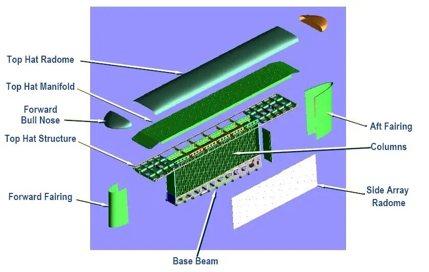 E-7“楔尾”预警机是基于波音737-700客机平台开发的空中预警与控制平台,旨在取代美国空军日益老化的E-3“望楼”预警机队。目前,该型机已在澳大利亚、韩国和土耳其等国服役,英国也在引进。E-7A 预警机长33.6米,翼展35.6米,机高12.5米,巡航速度853千米/小时,航程6482千米,升限1.2万米,可空中加油,安装2台CFM56-7B27A涡扇发动机,每台推力120千牛,机组人员包括2名飞行员,10名任务机组人员。该机机身安装一台诺斯罗普·格鲁曼多用途电子扫描阵列(MESA)雷达,是一种工作在L波段的有源相控阵雷达,重4540千克,由T形的两种雷达阵面组成,垂直阵面长7.3米,高2.7米,扫描范围左右120°,顶置阵面长9.6米,前后扫描范围60°,因此具有360度全覆盖能力,从而克服了平衡木雷达的弊端。每个AESA天线阵面包含288个碳化硅(SiC)固态T/R元件,可在360度探测370千米以上,9000米高重点探测则可探测740千米以上,有消息说可达到850千米,可跟踪300个目标,锁定180个目标,同时指挥24架(一说80架以上)飞机作战。E-7在航程、速度和巡航高度上具有天然优势,能够更好地融入美国空军以高性能战机为主的作战体系,