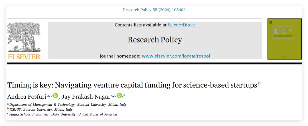 (原文信息:Fosfuri, A., & Nagar, J. P. (2026). Timing is key: Navigating venture capital funding for science-based startups. Research Policy, 55, 105402)