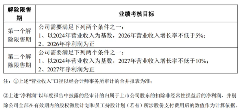 公司层面业绩考核年度为2026年、2027年两个会计年度,每个会计年度考核一次,以达到业绩考核目标作为激励对象当年度的解除限售条件之一。各年度业绩考核目标如下表所示:
