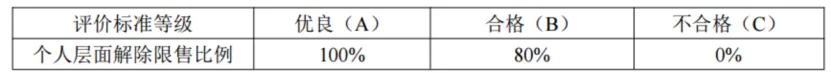 个人层面绩效考核按照公司制定的个人绩效考核相关规定组织实施,并依照激励对象的考核结果确定其实际解除限售的股份数量。激励对象的绩效考核分数划分为3个档次,届时根据以下考核评级表中对应的个人层面考核结果确定激励对象的解除限售比例: