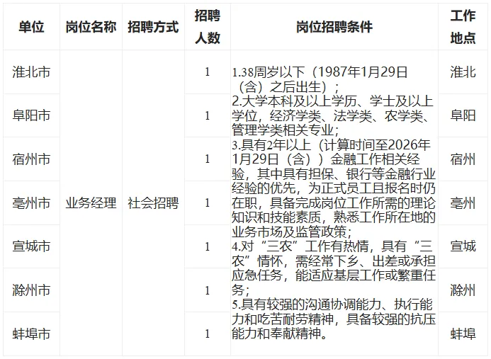 本次计划社会招聘7名工作人员,专职负责江淮粮仓担保公司市县业务工作。具体岗位条件如下: