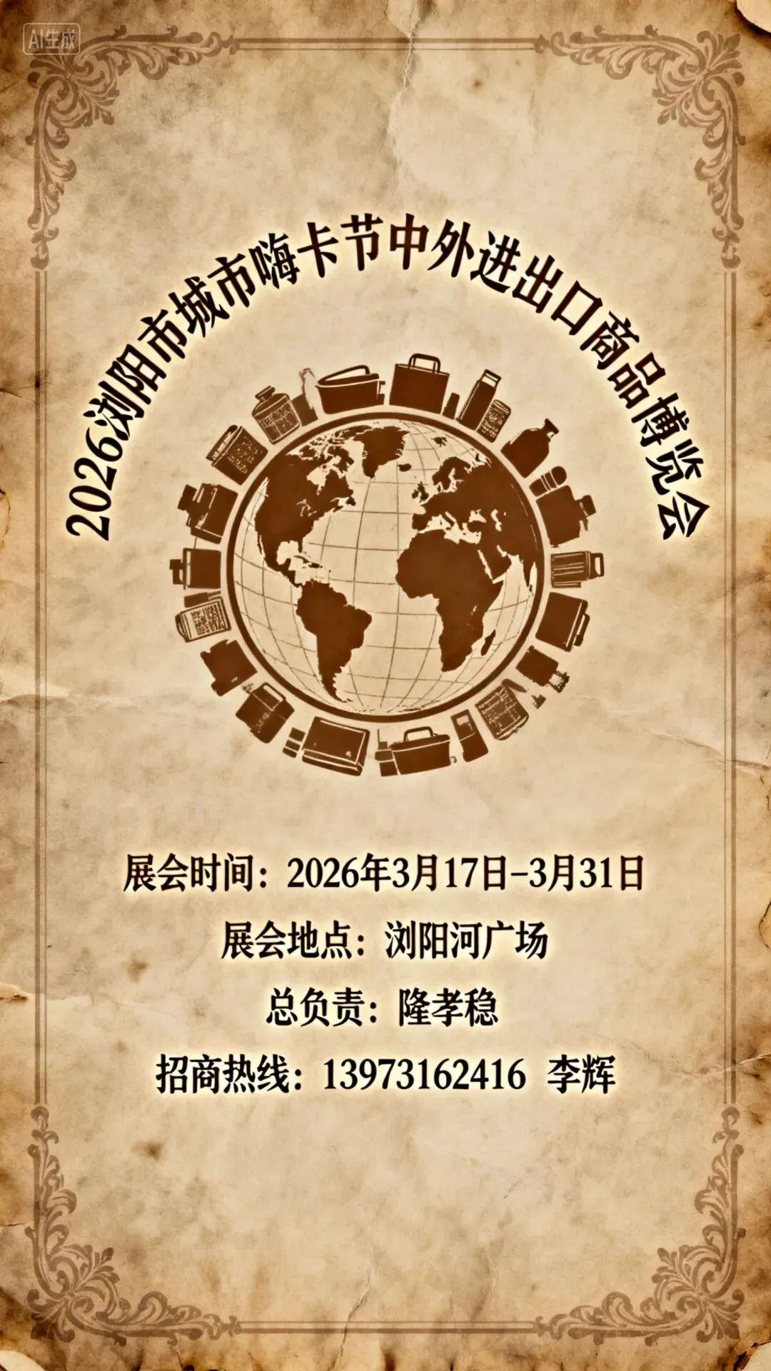 2026浏阳市城市嗨卡节中外进出口商品博览会,将于2026年3月17日至3月31日,在浏阳河广场隆重举行。