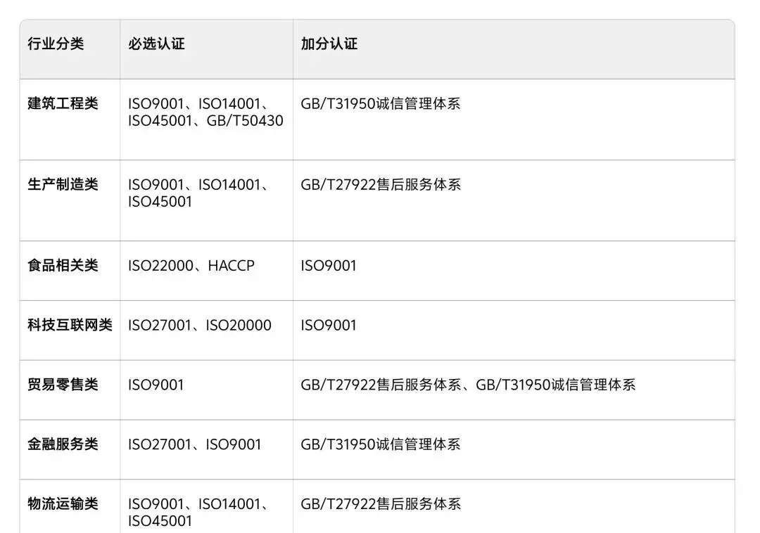 这类认证几乎适用于所有行业,是参与投标的“入场券”,部分地区还会对通过认证的企业给予财政补贴。
