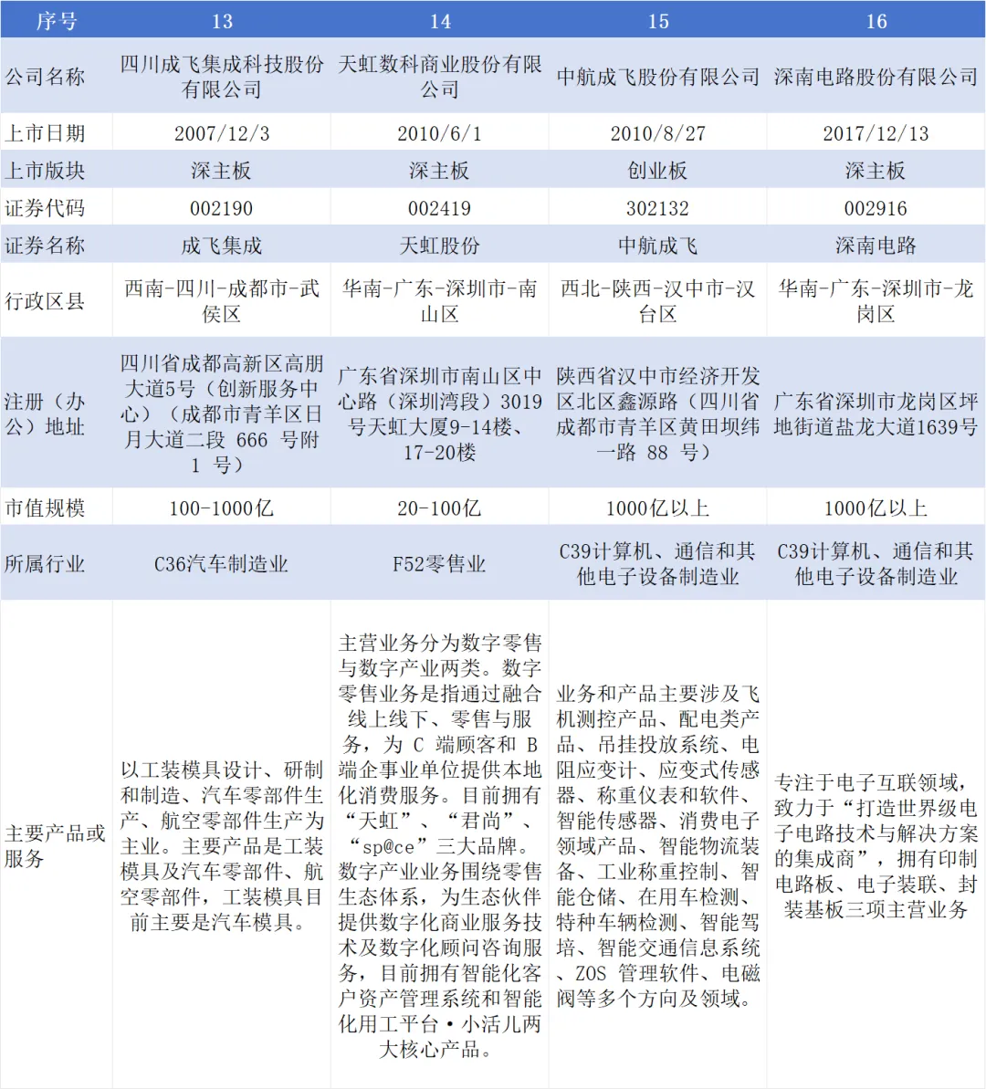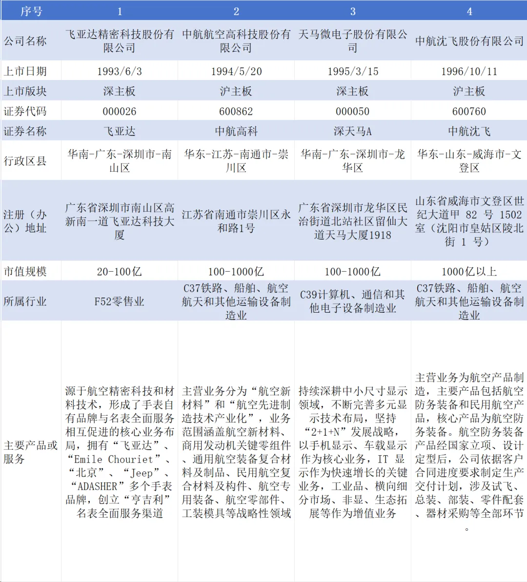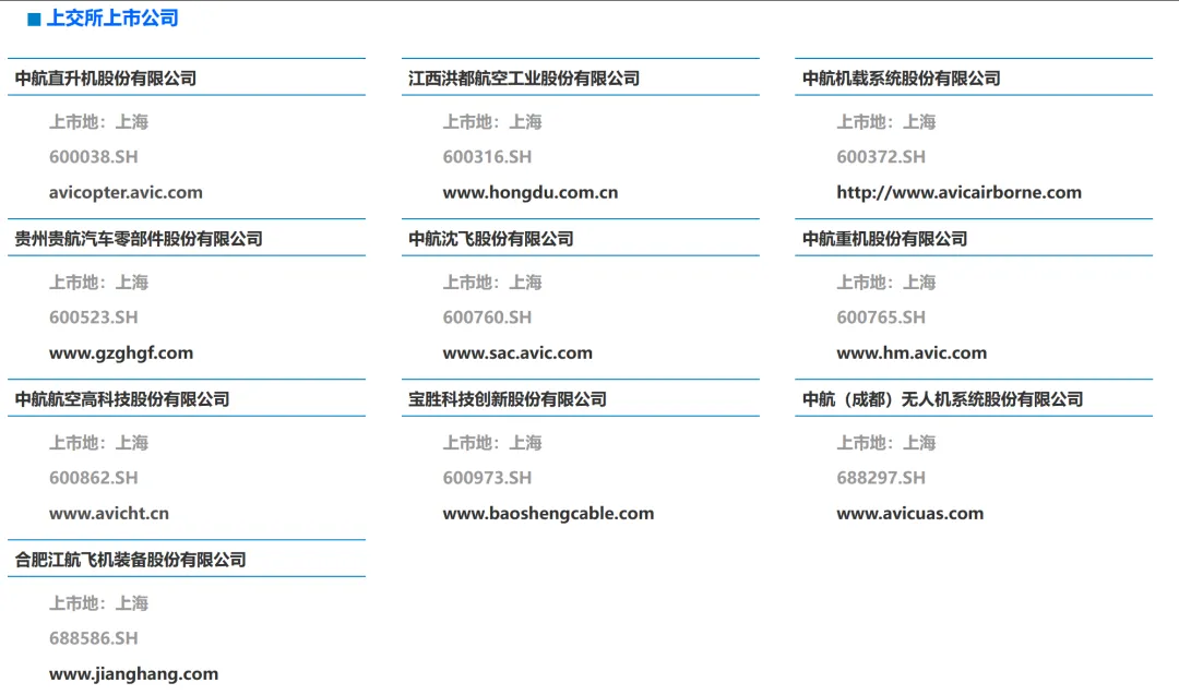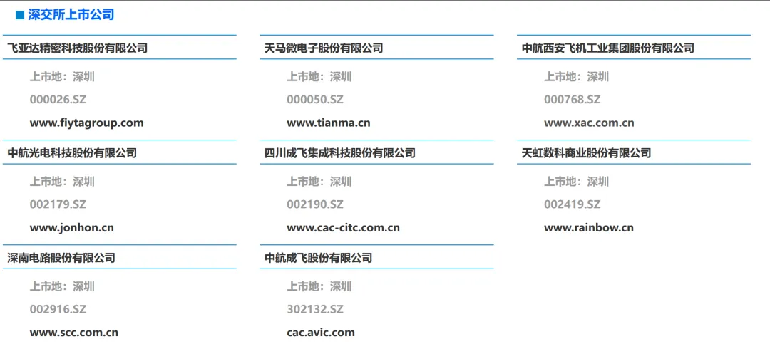 截至目前,航空工业集团下属A股上市公司19家,分别为飞亚达(000026,另B股200026)、中航高科(600862)、深天马A(000050)、中航沈飞(600760)、中航重机(600765)、中航西飞(000768)、洪都航空(600316)、中直股份(600038)、中航电子(600372)、贵航股份(600523)、宝胜股份(600973)、中航光电(002179)、成飞集成(002190)、天虹股份(002419)、中航成飞(302132)、深南电路(002916)、富士达(920640)、江航装备(688586)、中无人机(688297);已终止上市A股公司2家,分别为中航机电(002013)于2023年被中航机载(600372,原“中航电子”)换股吸收合并,中航产融(600705)于2025年主动撤回;另有港股上市公司4家,分别为西锐(HK.02507)、大陆航空科技控股(HK.00232)、耐世特(HK.01316)、中航科工(HK.02357);境外上市公司2家,分别为KWG.DF(德国)、FACC.VI(奥地利)。如下图所示:图片来源:航空工业集团官方网站3.控股A股上市公司基本信息