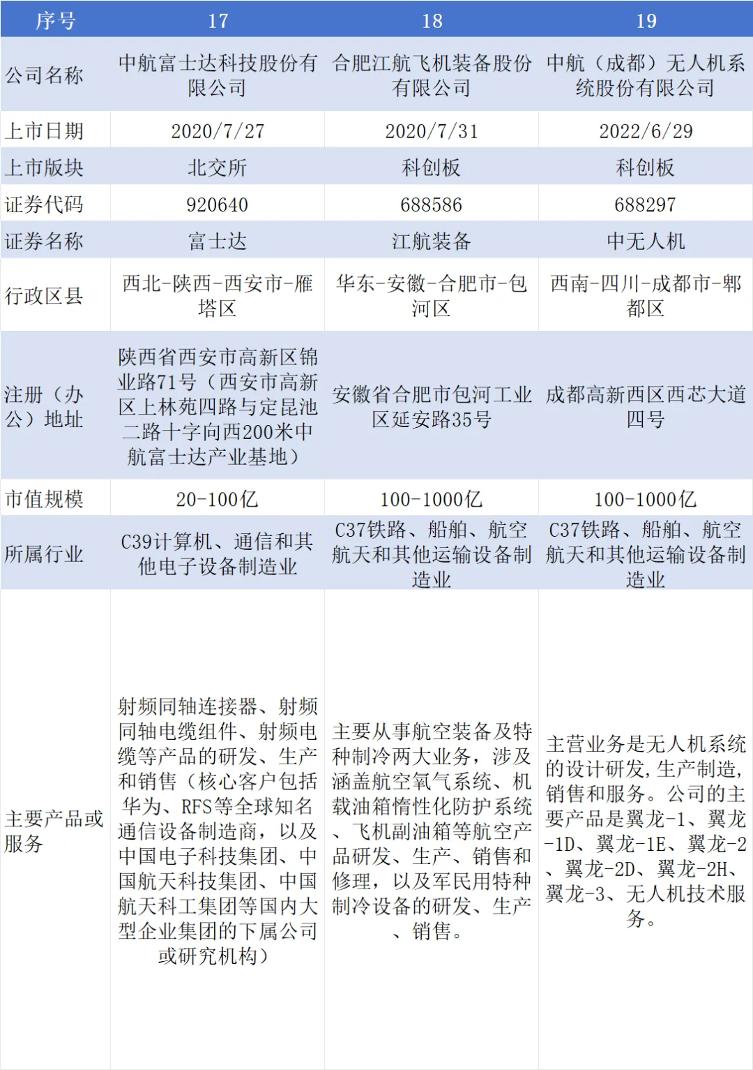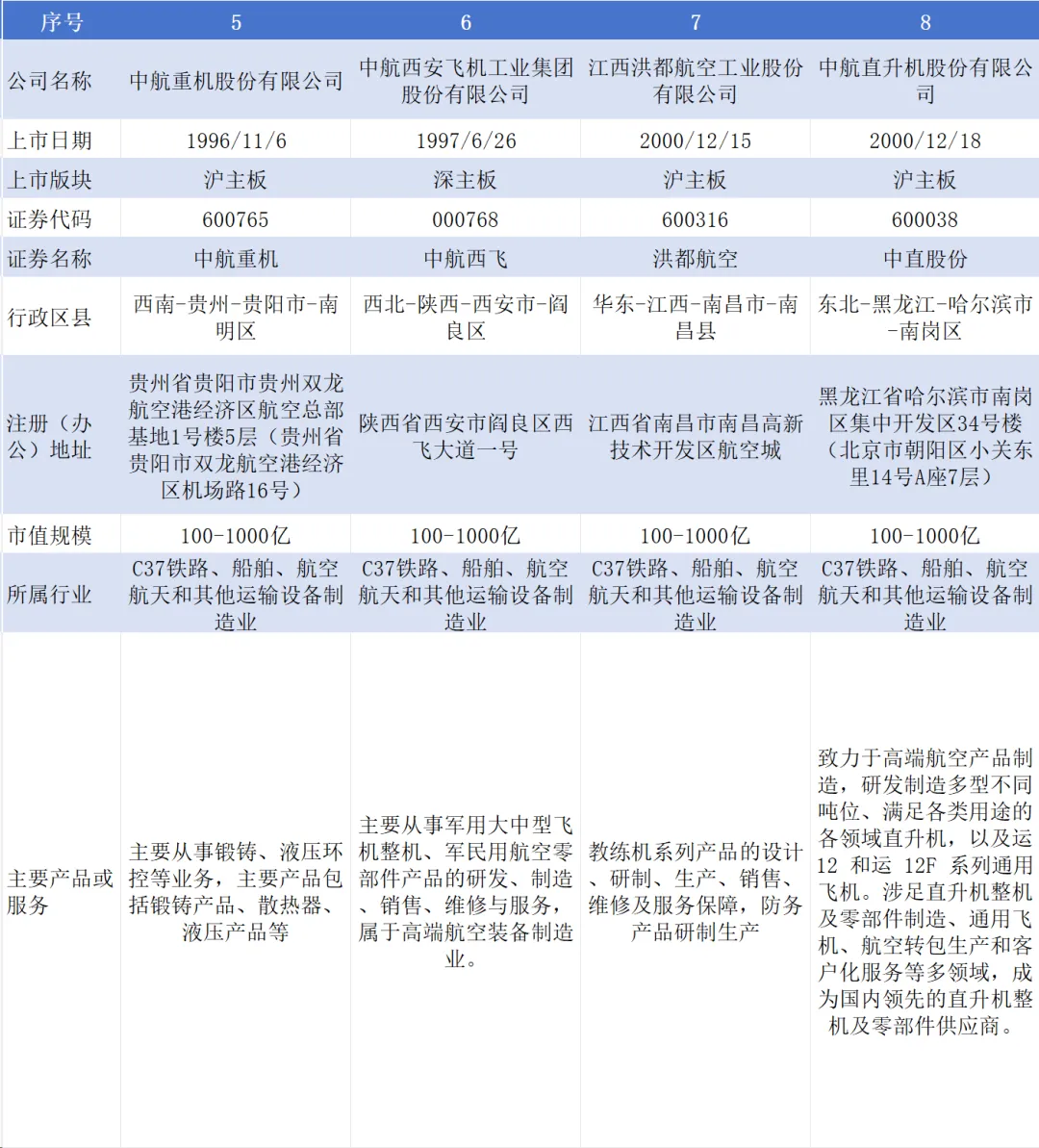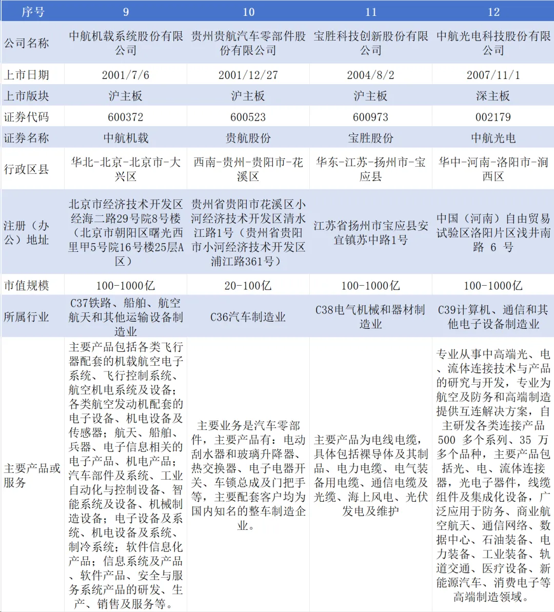 截至目前,航空工业集团下属A股上市公司19家,分别为飞亚达(000026,另B股200026)、中航高科(600862)、深天马A(000050)、中航沈飞(600760)、中航重机(600765)、中航西飞(000768)、洪都航空(600316)、中直股份(600038)、中航电子(600372)、贵航股份(600523)、宝胜股份(600973)、中航光电(002179)、成飞集成(002190)、天虹股份(002419)、中航成飞(302132)、深南电路(002916)、富士达(920640)、江航装备(688586)、中无人机(688297);已终止上市A股公司2家,分别为中航机电(002013)于2023年被中航机载(600372,原“中航电子”)换股吸收合并,中航产融(600705)于2025年主动撤回;另有港股上市公司4家,分别为西锐(HK.02507)、大陆航空科技控股(HK.00232)、耐世特(HK.01316)、中航科工(HK.02357);境外上市公司2家,分别为KWG.DF(德国)、FACC.VI(奥地利)。如下图所示:图片来源:航空工业集团官方网站3.控股A股上市公司基本信息