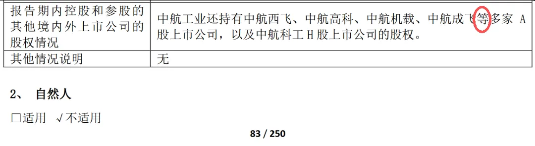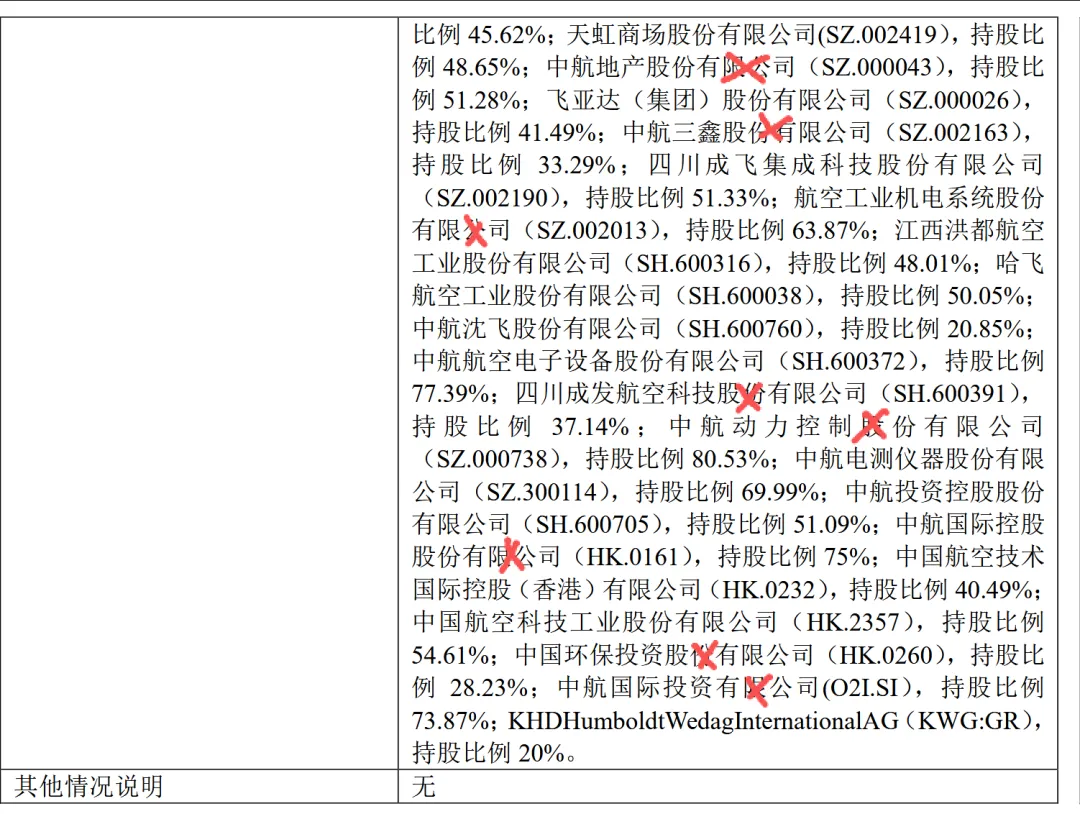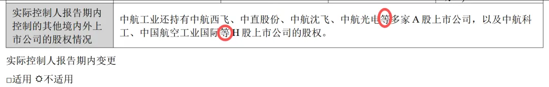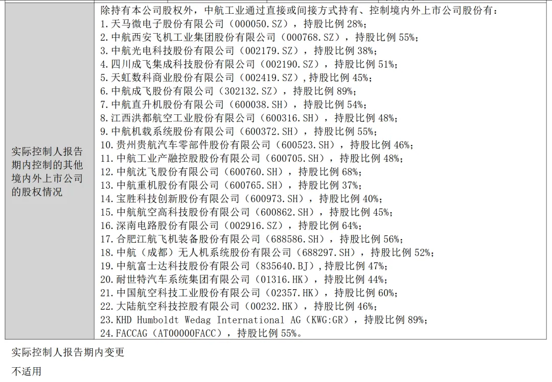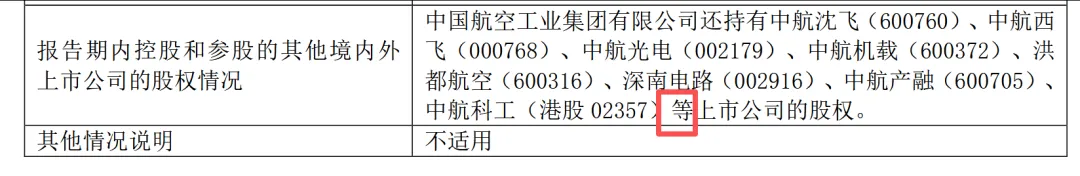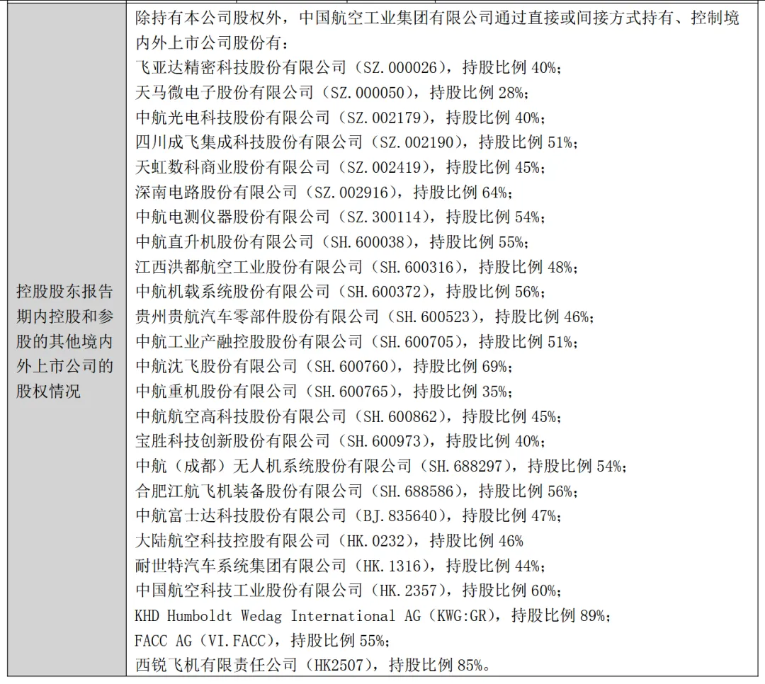 宝胜股份2024年年报披露的实际控制人为中国航空工业集团有限公司,报告期内控股和参股的其他境内外上市公司的股权情况错批西安航空动力股份有限公司(SH.600893)、中航地产股份有限公司(SZ.000043)、中航三鑫股份有限公司(SZ.002163)、航空工业机电系统股份有限公司(SZ.002013)、四川成发航空科技股份有限公司(SH.600391)、中航动力控制股份有限公司(SZ.000738)、中航国际控股股份有限公司(HK.0161)、中国环保投资股份有限公司(HK.0260)、中航国际投资有限公司(O2I.SI),同时存在披露不完整,股权比例描述与实际不符的情况。中航沈飞、中航成飞、江航装备、中无人机2024年年报披露的实际控制人为中国航空工业集团有限公司,报告期内控股和参股的其他境内外上市公司的股权情况采用了“略批”