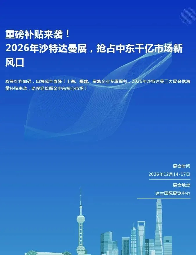 补贴加持+市场风口+优质展会,2026年沙特达曼展无疑是中国企业拓展中东市场的最佳契机。把握“2030愿景”战略红利,抢占中东工业核心市场,就从2026沙特达曼展开始!名额有限,速来锁定展位,解锁出海新可能!