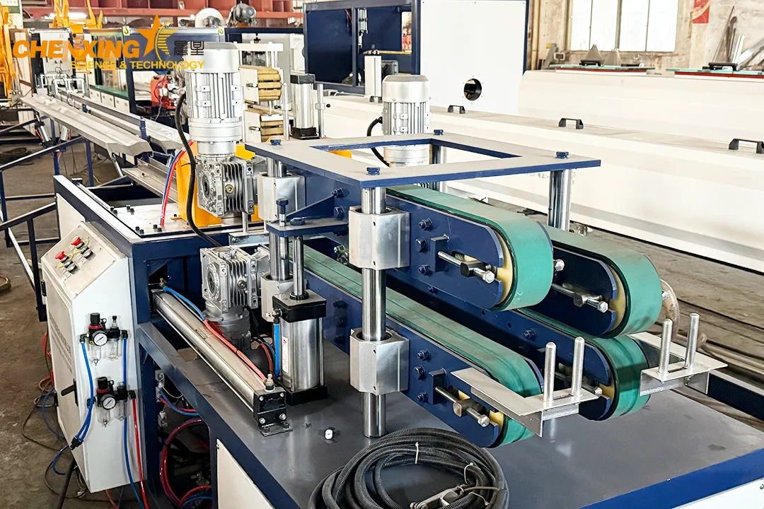✔ 锥形双螺杆挤出机✔ 双腔模具✔ 真空定径冷却箱✔ 双履带牵引机✔ 自动切割机✔ 成品堆放架