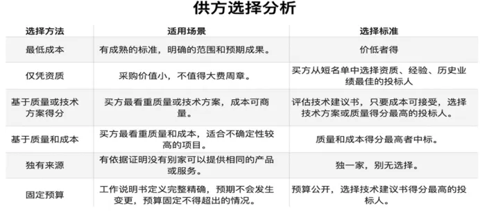 供方选择标准 | 针对不同的标准,可以用数值分数、颜色代码或书面描述,来说明卖方满足采购组织需求的程度。这些标准是加权系统的组成部分,可据此以加权打分的方法排序所有建议书的顺序,以便确定谈判的顺序,并与某个卖方签订合同。 |