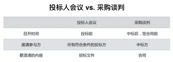 投标人会议 | 投标人会议是在卖方提交建议书之前,在买方和潜在卖方之间召开的会议,其目的是确保所有潜在投标人对采购要求都有清楚且一致的理解,并确保没有任何投标人会得到特别优待。 |