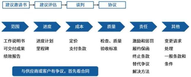 采购谈判 | 在合同签署之前,对合同内容加以澄清,以取得一致意见。包括责任、变更的权限、使用的条款和法律、技术和商务要求、所有权、合同融资、技术解决方案、总体进度计划、付款以及价格等。 |