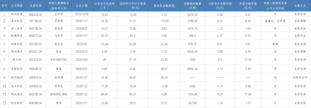 事实上,这样的“离婚分割股权大戏”并不少见。《每日经济新闻》记者统计发现,2025年全年共有12家上市公司因实控人离婚卷入股权分割,股权分割的总市值从公告当日的57.83亿元涨到年底的63.21亿元,并且没有实控人及前任实施减持。