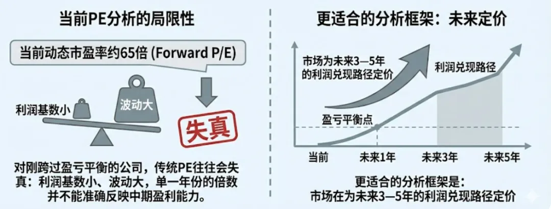 当前动态市盈率约65倍(Forward P/E)。对刚跨过盈亏平衡的公司,传统PE往往会失真:利润基数小、波动大,单一年份的倍数并不能准确反映中期盈利能力。
