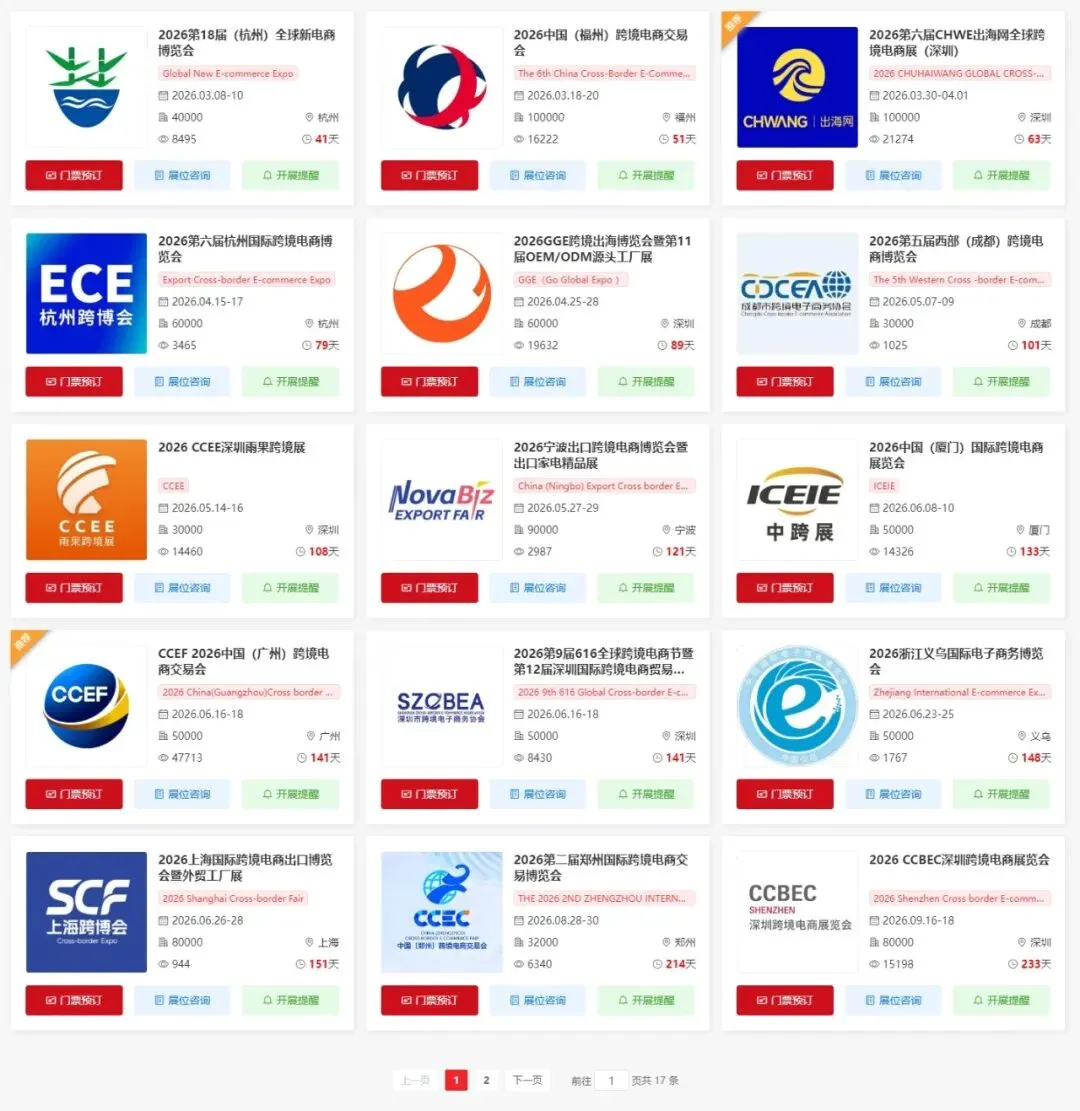 2026年全国跨境电商展会将会在哪些城市举办?小编为您提供2026年全国跨境电商展会时间、展馆地址以及入场门票。接下来让我们一起来了解下全国跨境电商展会2026年时间表!末文获取2026跨境电商展会门票预约入口~(大多门票限时免费)