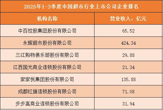 根据申万行业分类,2025年1-3季度中国超市行业上市公司按营业收入排名如下:(A股上市公司)