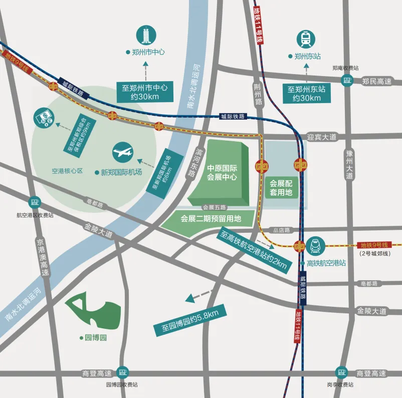 独一无二的区位,展馆坐落于郑州航空港区核心,真正实现“机场东、高铁西”的夹心优越位置,紧邻郑州航空港高铁站,距新郑国际机场仅约6公里。多式联运网络:集成空、铁、陆、海高效联运。机场拥有密集的全货机航线,高铁“2小时经济圈”可覆盖全国90%人口和主要经济圈。从航空港区发向全国大部分地区都可实现次日达,能极大降低客商往来与展品物流的时间与成本。