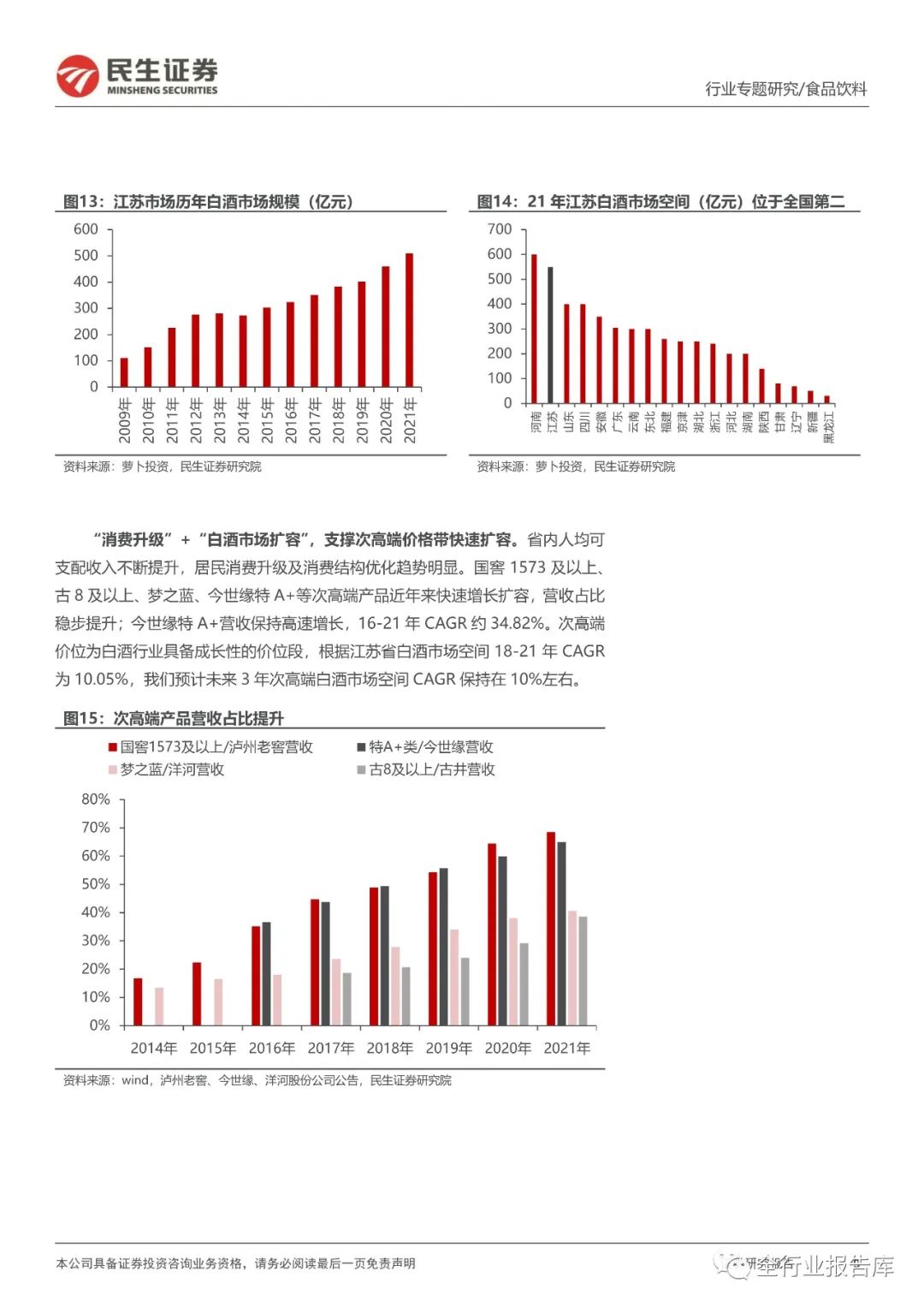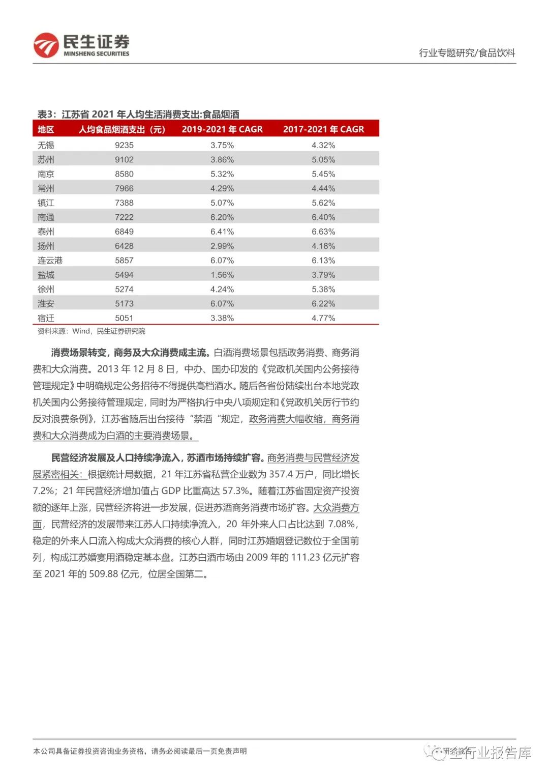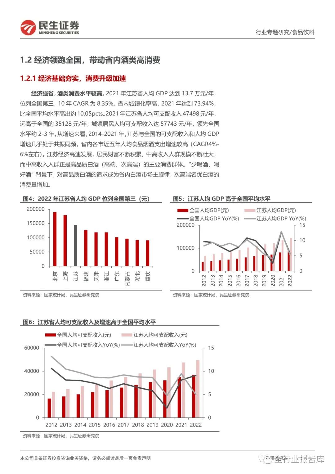 本篇行业报告:【民生证券】白酒江苏区域专题研究系列,完整版页数共48页,为保障星球社群会员权益、仅展示前10页、成为会员后可无限制下载原文报告及历史行业研究报告。>苏酒市场:双龙头局面,经济基础塑造产品结构及核心价位段。江苏经济高速发展,居民财富不断积累,高品质白酒消费群体不断壮大,苏酒市场持续扩容,全省白酒规模约560亿元。江苏地产酒集中度较高,2021年CR10=87.1%,洋河股份、今世缘市占率分别为28.58%/22.17%,占据绝对优势。分区域看,江苏省内南北经济发展存在差异,苏北主流价格带在400元左右,地产酒优势明显;苏南区域主流价格带600元以上,高端、全国化次高端酒占优势。分价位看,高端酒(900元以上)茅五泸占据绝对优势,苏酒仍处在导入期;次高端(300-900元)苏酒占据地利优势,省内核心价位段重点发力。