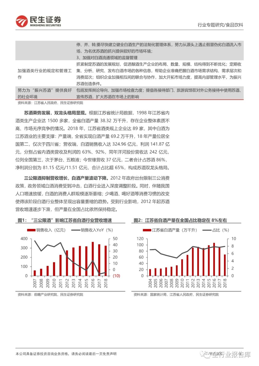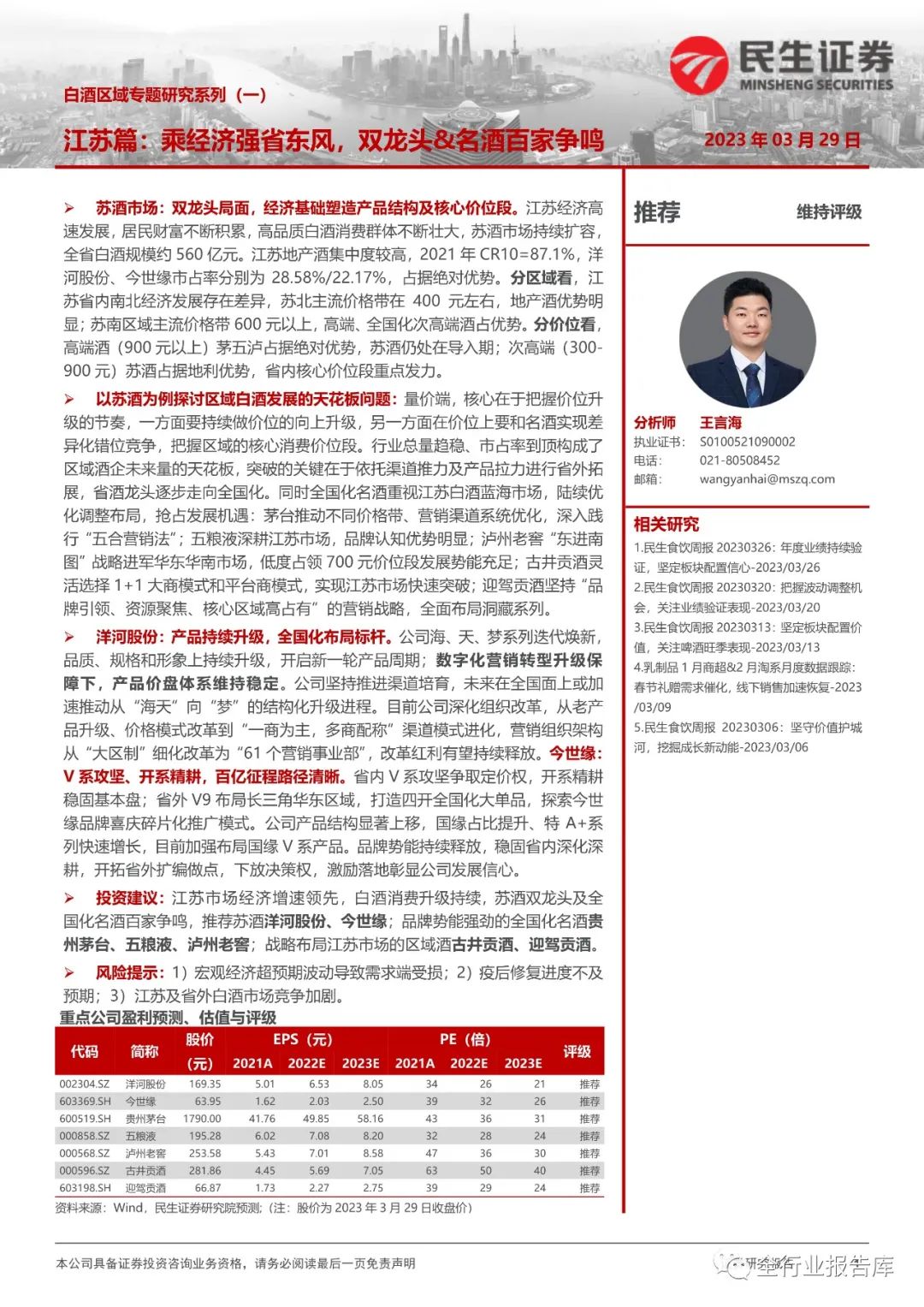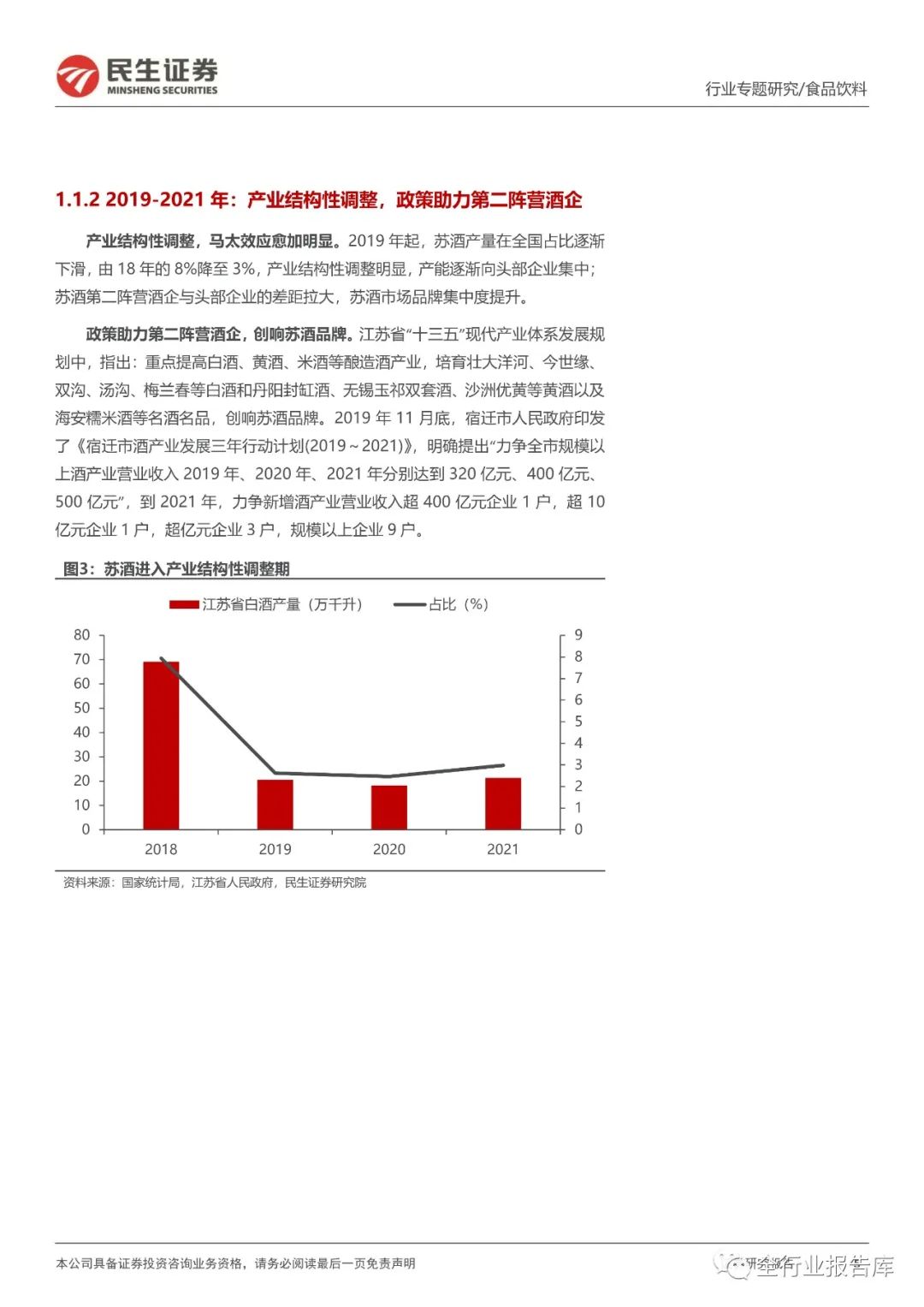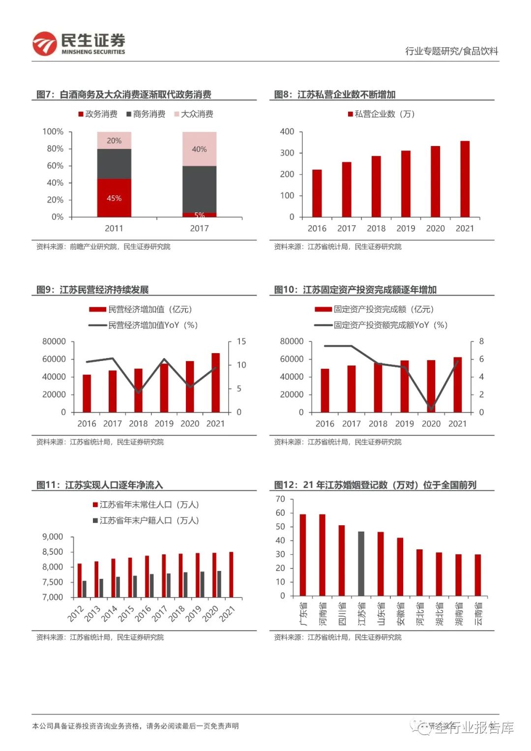 本篇行业报告:【民生证券】白酒江苏区域专题研究系列,完整版页数共48页,为保障星球社群会员权益、仅展示前10页、成为会员后可无限制下载原文报告及历史行业研究报告。>苏酒市场:双龙头局面,经济基础塑造产品结构及核心价位段。江苏经济高速发展,居民财富不断积累,高品质白酒消费群体不断壮大,苏酒市场持续扩容,全省白酒规模约560亿元。江苏地产酒集中度较高,2021年CR10=87.1%,洋河股份、今世缘市占率分别为28.58%/22.17%,占据绝对优势。分区域看,江苏省内南北经济发展存在差异,苏北主流价格带在400元左右,地产酒优势明显;苏南区域主流价格带600元以上,高端、全国化次高端酒占优势。分价位看,高端酒(900元以上)茅五泸占据绝对优势,苏酒仍处在导入期;次高端(300-900元)苏酒占据地利优势,省内核心价位段重点发力。
