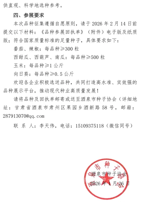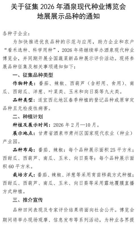 关于征集2026年酒泉现代种业博览会地展展示品种的通知