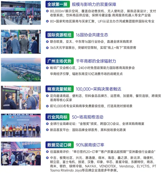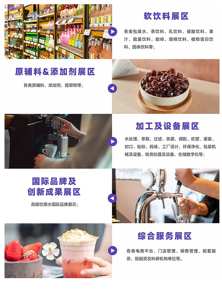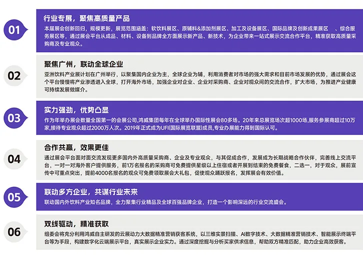 创新回归升级规模,设软饮料、原辅料、加工设备等多展区,全链展示新品新技术,打造一站式交流平台,精准对接高质量采购商与专业观众。 - 立足广州,辐射全球